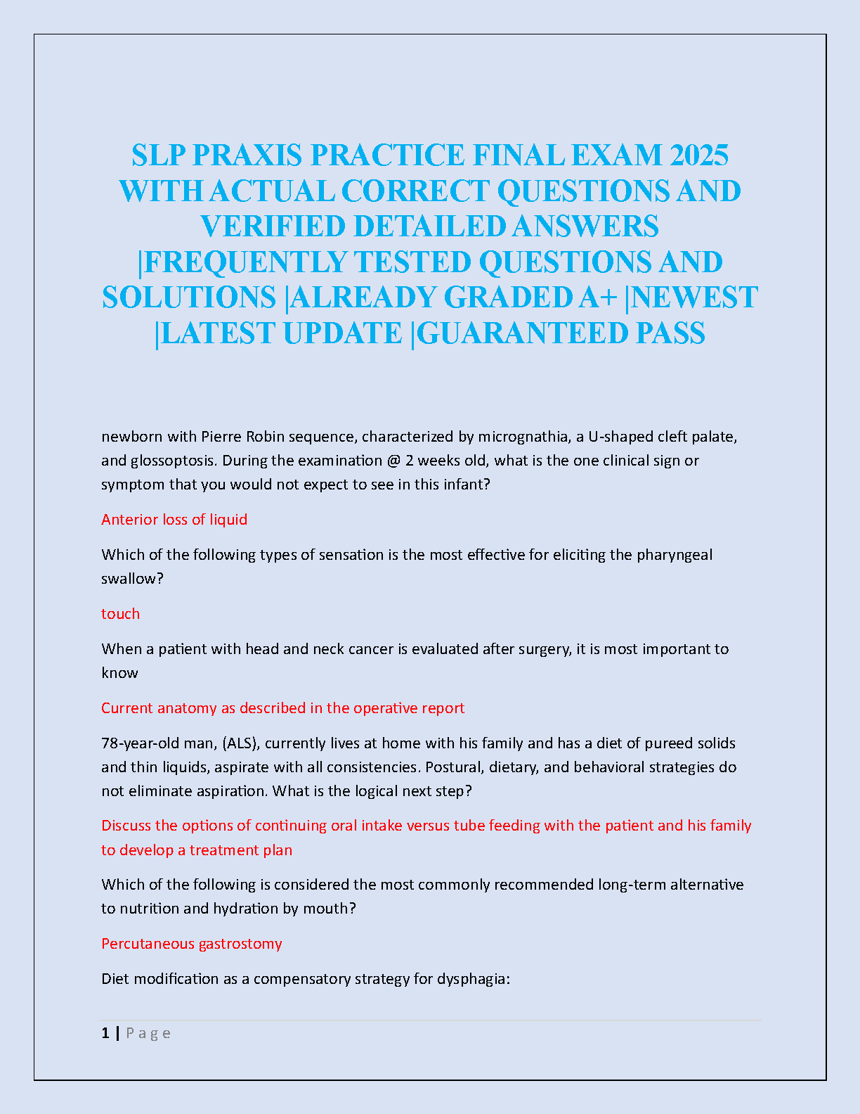SLP PRAXIS Final Exam 2025/2026: Test Bank with Actual Questions & Verified Answers | Guaranteed Pass