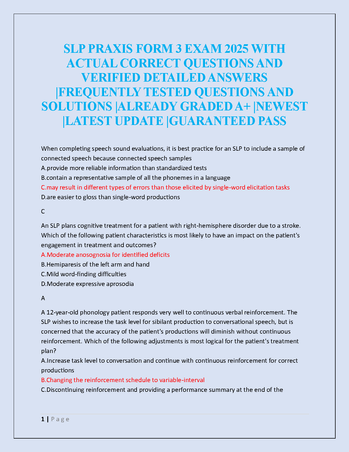 SLP Praxis Form 3 Test Bank by ETS, 2025 Edition | Verified Questions & Answers for a Guaranteed A+ Grade
