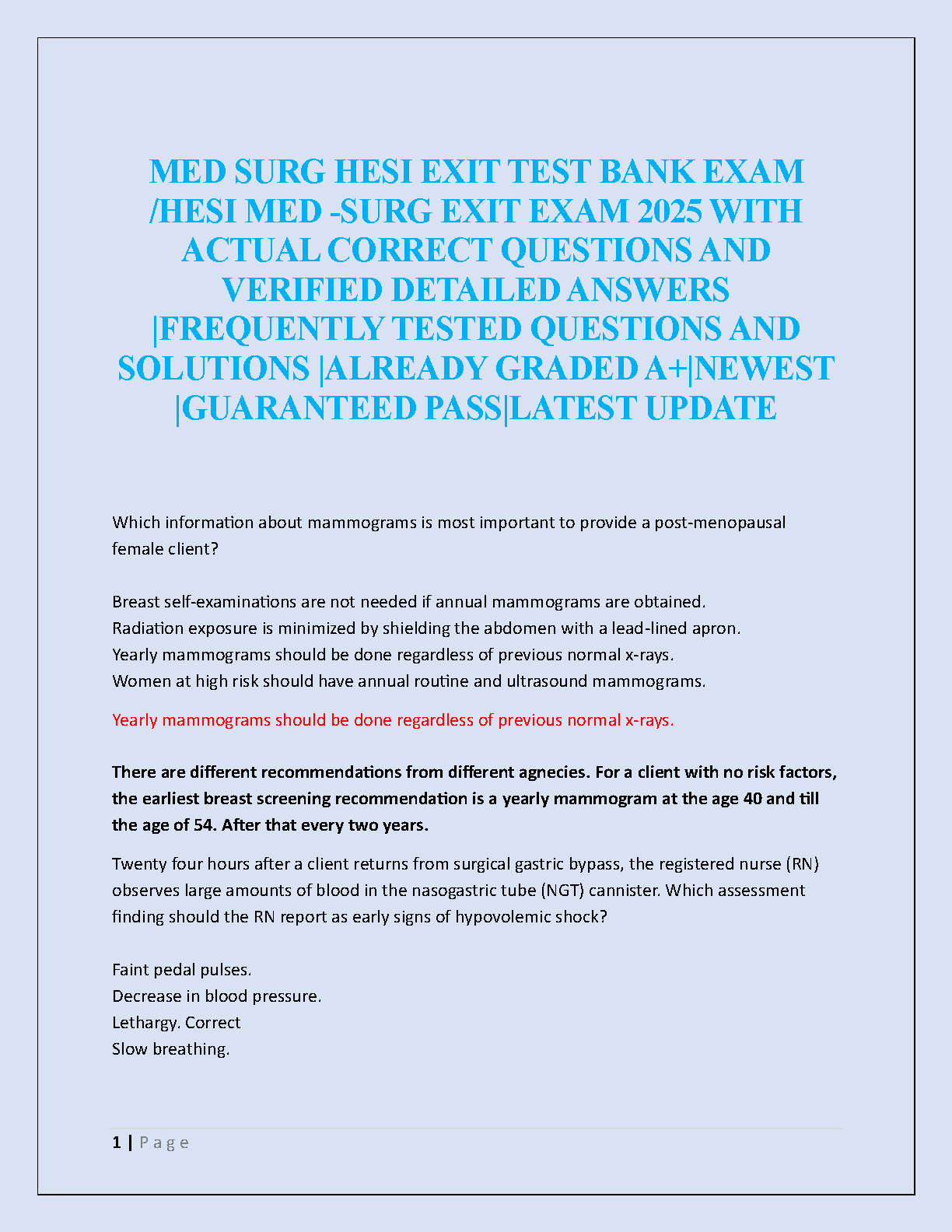 Ace your HESI Med-Surg Exit Exam on the first try! This comprehensive 2025 test bank provides a complete collection of frequently tested questions, meticulously verified answers, and detailed rationales. Designed to mirror the actual exam, our resource helps you master key concepts, understand the reasoning behind each answer, and build the confidence needed to achieve an A+ grade. Stop worrying about resits and start preparing for success with the latest, most accurate study guide available for the 2025/2026 academic year.
