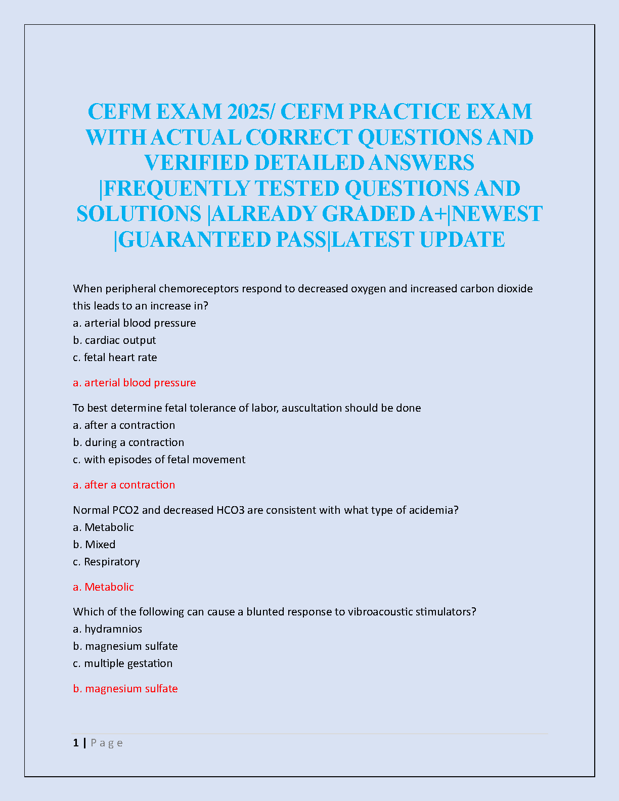 Ace your Certificate in Electronic Fetal Monitoring (CEFM) exam on the first attempt with our comprehensive 2025/2026 test bank. This premium study resource features the latest, frequently tested questions and actual exam content, complete with verified, detailed answers and solutions. Our material is already graded A+, ensuring you study with the most accurate and effective information available. Prepare confidently, master key concepts, and secure your CEFM certification without the stress of resits. Get immediate access to this essential guide for guaranteed success!