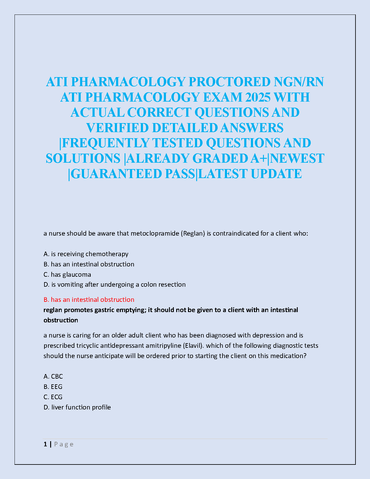 Prepare to excel on your ATI Pharmacology Proctored NGN/RN Exam with our newest 2025 test bank. This comprehensive study guide features a complete set of actual, frequently tested exam questions, each with verified, detailed answers and clear rationales. Designed to mirror the real NGN-style assessment, this resource is already graded A+ and is your key to mastering pharmacology concepts. Boost your confidence and secure a top grade—this is the ultimate tool to help you pass on your first try and avoid resits. Download now and start studying smarter!