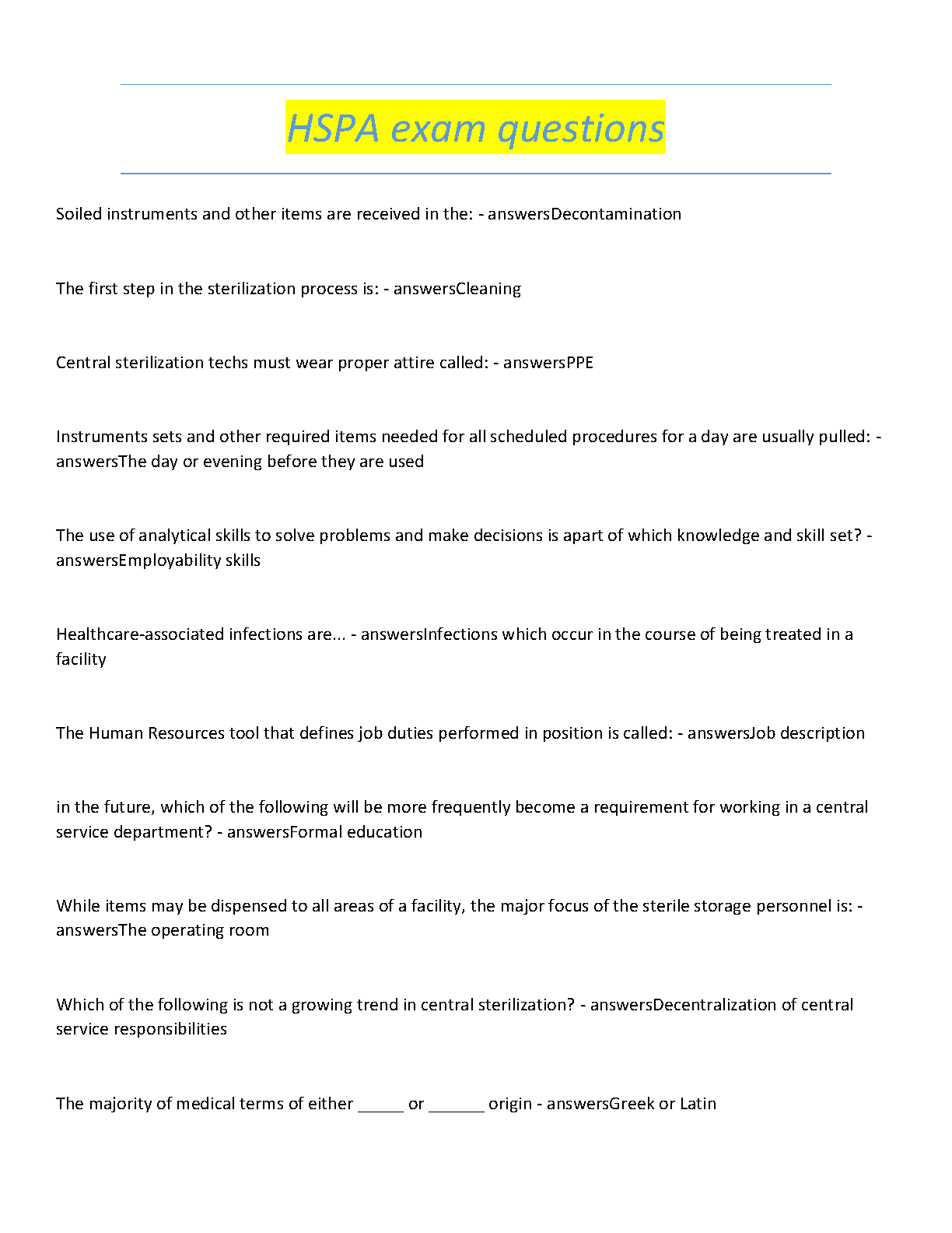 Ace your HSPA certification exam with our comprehensive test bank for the Central Service Technical Manual, 9th Edition, authored by the Healthcare Sterile Processing Association. This essential study resource provides a vast collection of exam-style questions and detailed answers, covering all critical topics from decontamination and sterilization to infection control and professional responsibilities. Designed to help you master the material efficiently, this test bank is your key to passing the CRCST exam on your first attempt and launching your career in sterile processing. Get instant access and start preparing for success today!