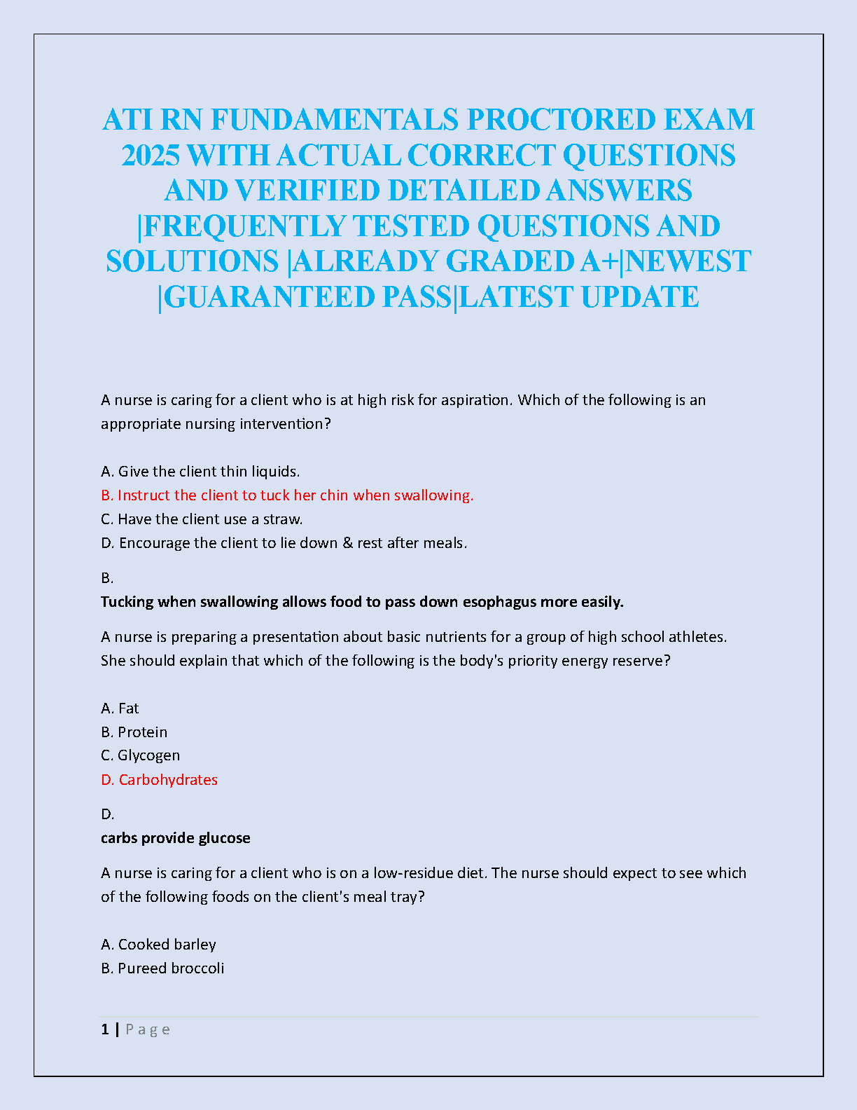 Ace your ATI RN Fundamentals Proctored Exam on the very first try! This comprehensive test bank for the 2025/2026 academic year provides a complete collection of actual, frequently tested questions paired with verified, detailed answers and rationales. Designed to help nursing students master core concepts, this study guide is your key to achieving an A+ grade and passing with confidence. Avoid resits and prepare effectively with this latest, updated resource that guarantees success.