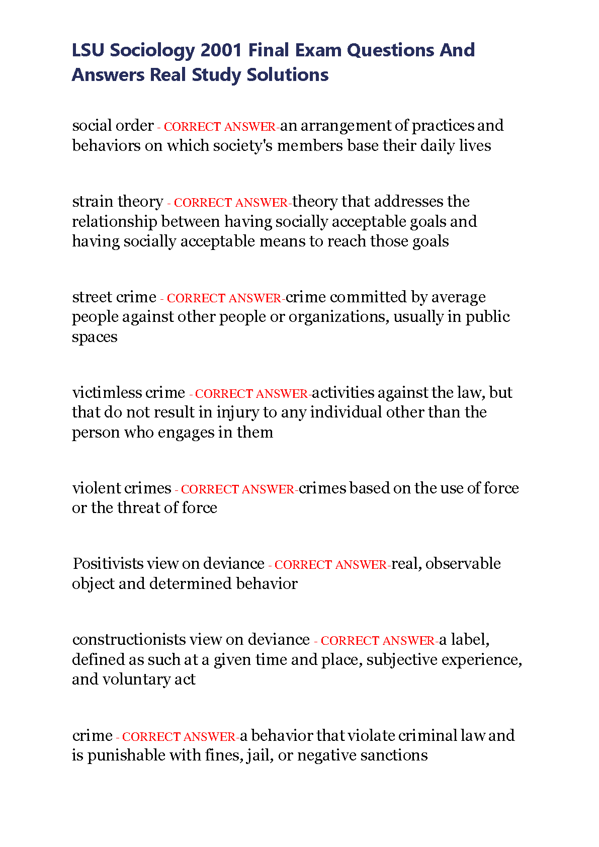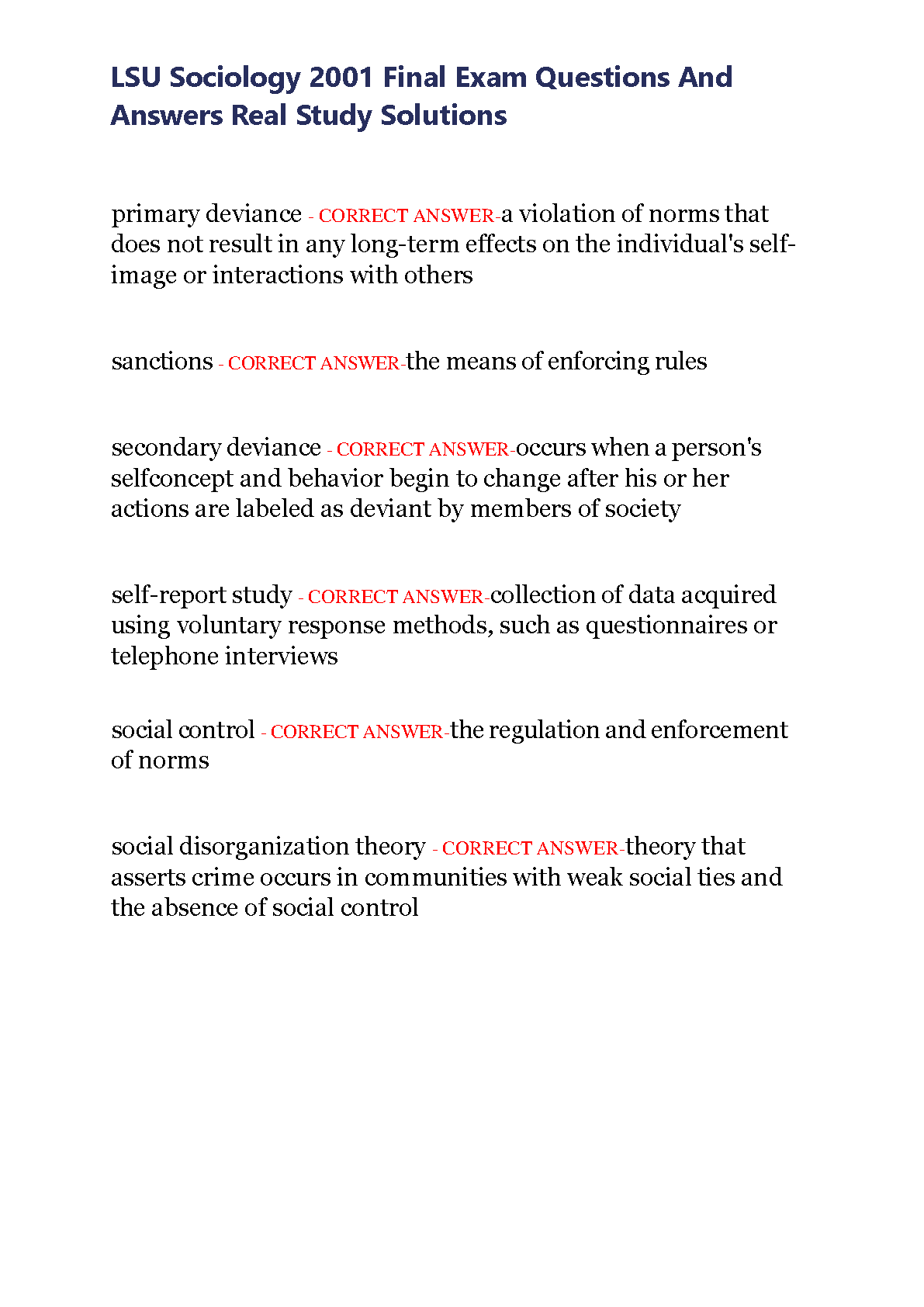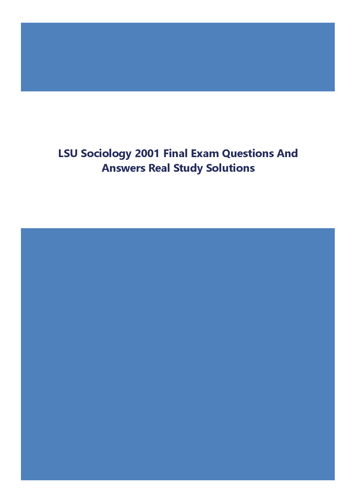 Master your LSU Introduction to Sociology (SOCI 2001) final exam with this complete test bank. This resource provides a comprehensive collection of real final exam questions, each paired with a verified, detailed answer. Designed to mirror the actual exam format and content, this study guide is your ultimate tool for effective preparation, helping you grasp key concepts, identify areas for improvement, and walk into your exam with confidence. Get the A+ you deserve by studying with these proven solutions.