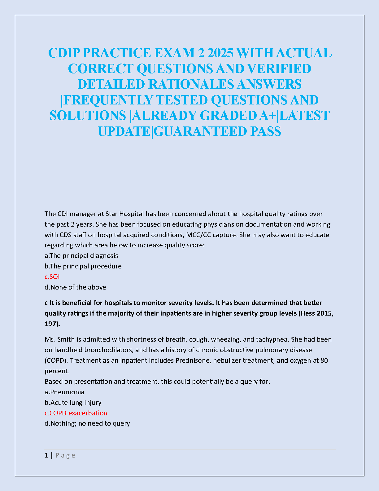 Prepare to ace your Certified Clinical Documentation Integrity Practitioner (CDIP) exam on your very first try with our comprehensive Practice Exam 2 Test Bank for the 2025/2026 academic year. This A+ graded resource is meticulously compiled with the latest, frequently tested questions directly relevant to the current CDIP exam syllabus. Each question is accompanied by a correct, verified answer and a detailed rationale to deepen your understanding of complex clinical documentation concepts, including MCC/CC capture, severity of illness (SOI), and proper querying. Stop worrying about resits and start studying with confidence. This updated study guide is your ultimate tool for a guaranteed pass.