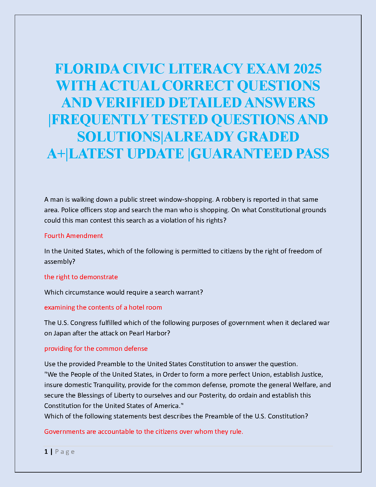 Ace the Florida Civic Literacy Exam (FCLE) with confidence using our comprehensive 2025/2026 test bank. This guide is your ultimate tool for success, featuring a curated collection of actual, frequently tested exam questions complete with detailed, verified answers. Each solution is A+ graded to ensure accuracy and clarity, helping you master key civic concepts from the U.S. Constitution to landmark Supreme Court cases. This latest update is specifically designed to help you pass the FCLE on your first attempt, saving you time and stress. Get the grade you deserve and fulfill your civic literacy requirement with ease!