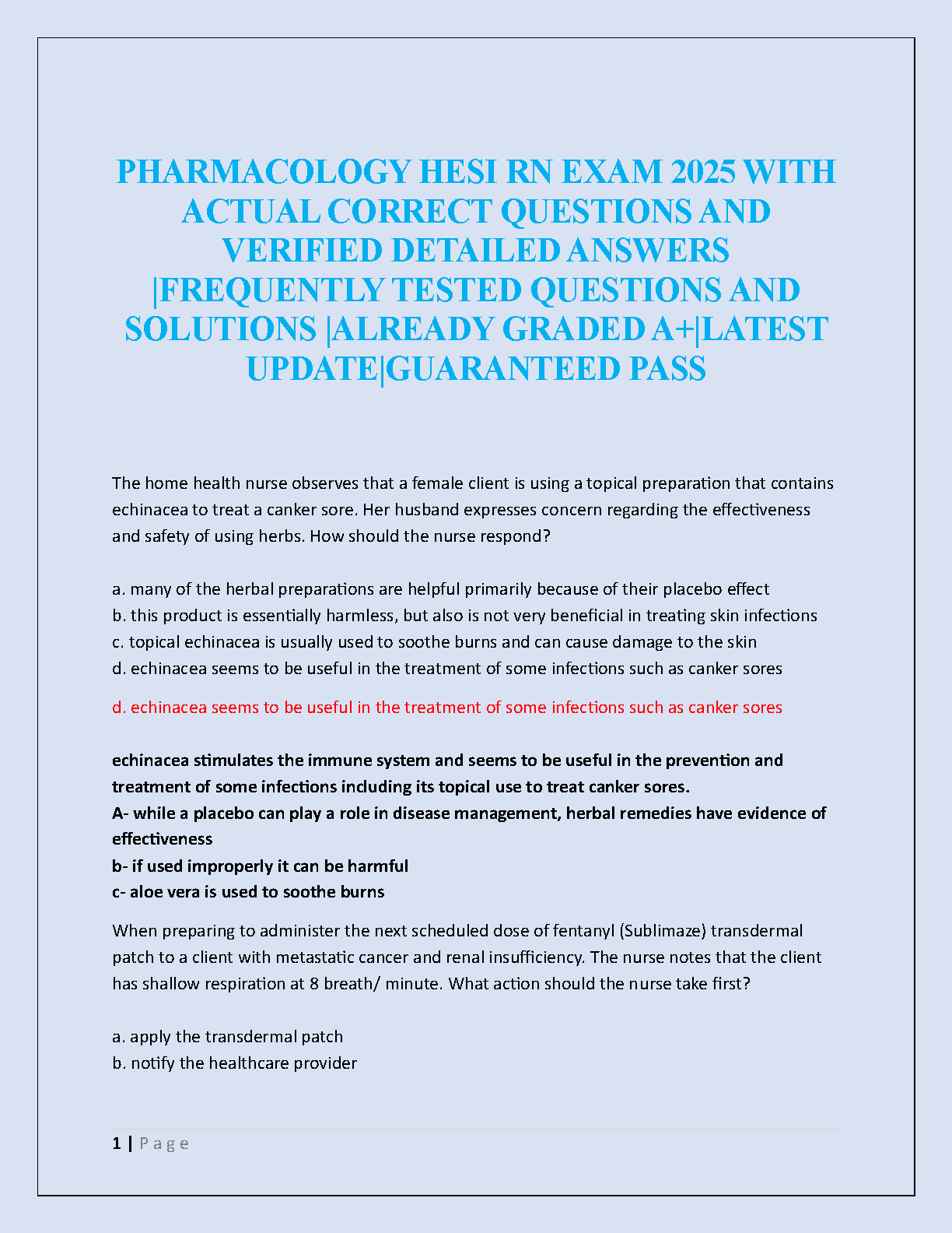 Master the HESI RN Pharmacology exam with our latest 2025-2026 test bank. This essential study guide features a complete collection of frequently tested questions, each with verified, detailed answers and rationales. Designed to help you understand complex pharmacology concepts and ace your exam on the first try, this resource is your key to achieving an A+ grade. Stop worrying about resits and start studying smart with our guaranteed-to-pass materials.