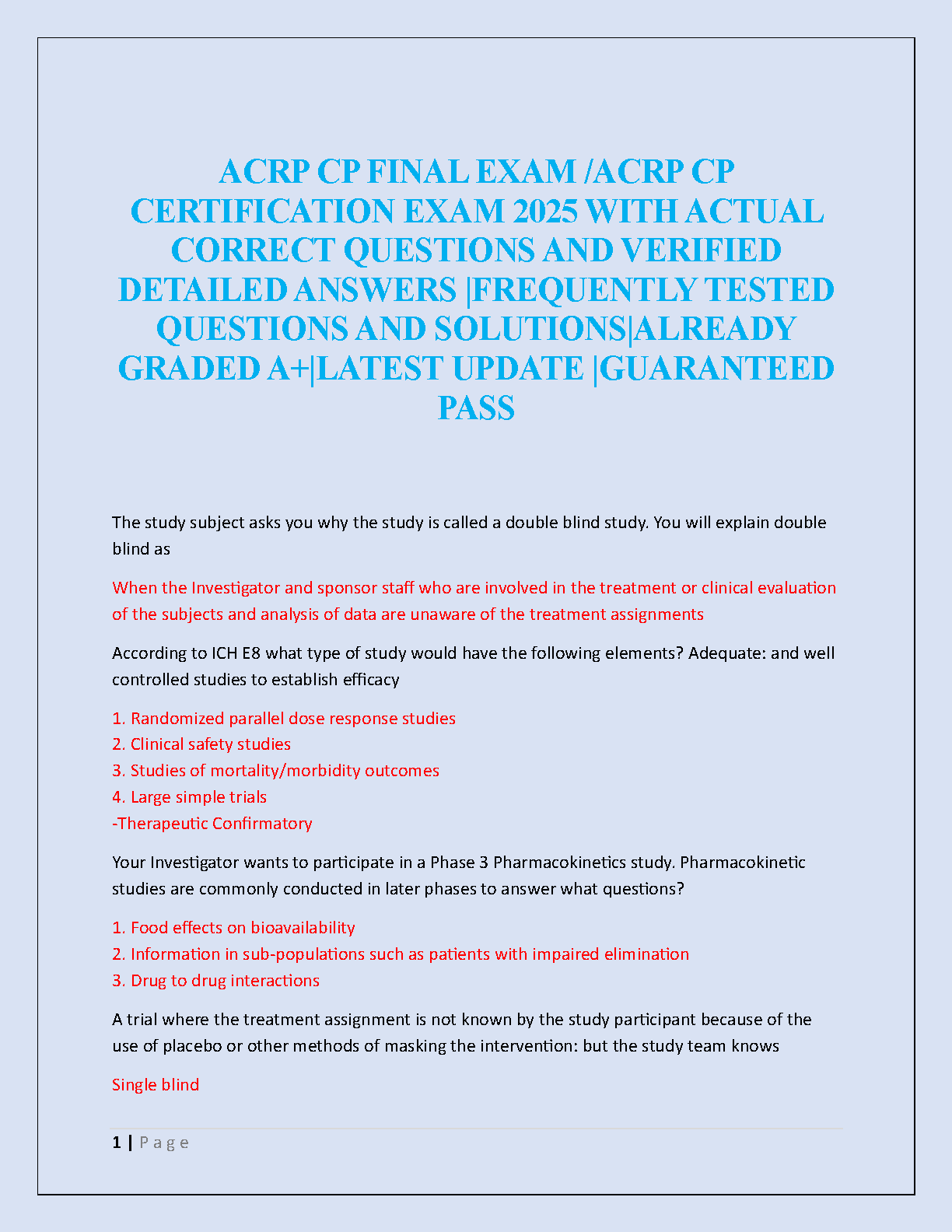 Unlock success in your clinical research career with our latest 2025 ACRP CP Certification Exam Test Bank. This comprehensive resource is packed with a wide range of actual exam questions and meticulously verified, detailed answers. Our study guide covers all essential topics, including study designs like double-blind trials, ICH guidelines, and pharmacokinetics, ensuring you are fully prepared for everything you'll face. Each solution is explained to deepen your understanding, making this the ultimate tool for achieving an A+ grade and passing your certification on the first try. Get the latest update and study with confidence!