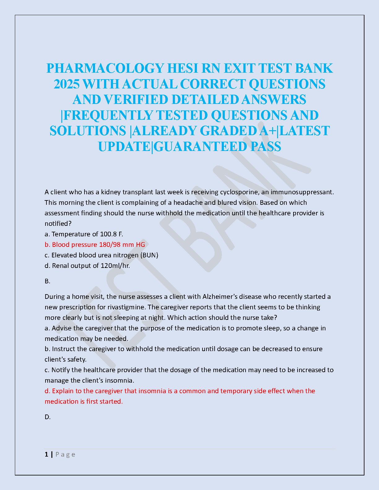 Master the pharmacology section of your HESI RN Exit Exam with our comprehensive 2025 test bank. This essential study resource is packed with frequently tested questions, 100% correct and verified answers, and in-depth rationales for every solution. Designed to help you study smarter, not harder, this guide covers all critical pharmacology topics, ensuring you are fully prepared to ace your exam and achieve an A+ grade. Secure your success and pass on your first attempt with this latest, updated collection.