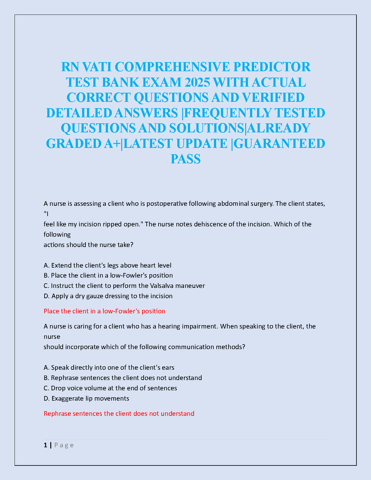 Ace your nursing final with the ultimate study resource! This is the latest 2025 edition of the Test Bank for the RN VATI Comprehensive Predictor Exam. Inside, you'll discover a complete collection of frequently tested questions, each paired with a verified, detailed answer and rationale. This guide is expertly compiled to ensure you grasp the core concepts and are fully prepared to achieve an A+ grade. Stop worrying about the exam and secure your success with our guaranteed pass materials. Perfect for nursing students aiming to master the curriculum and pass on their first attempt.