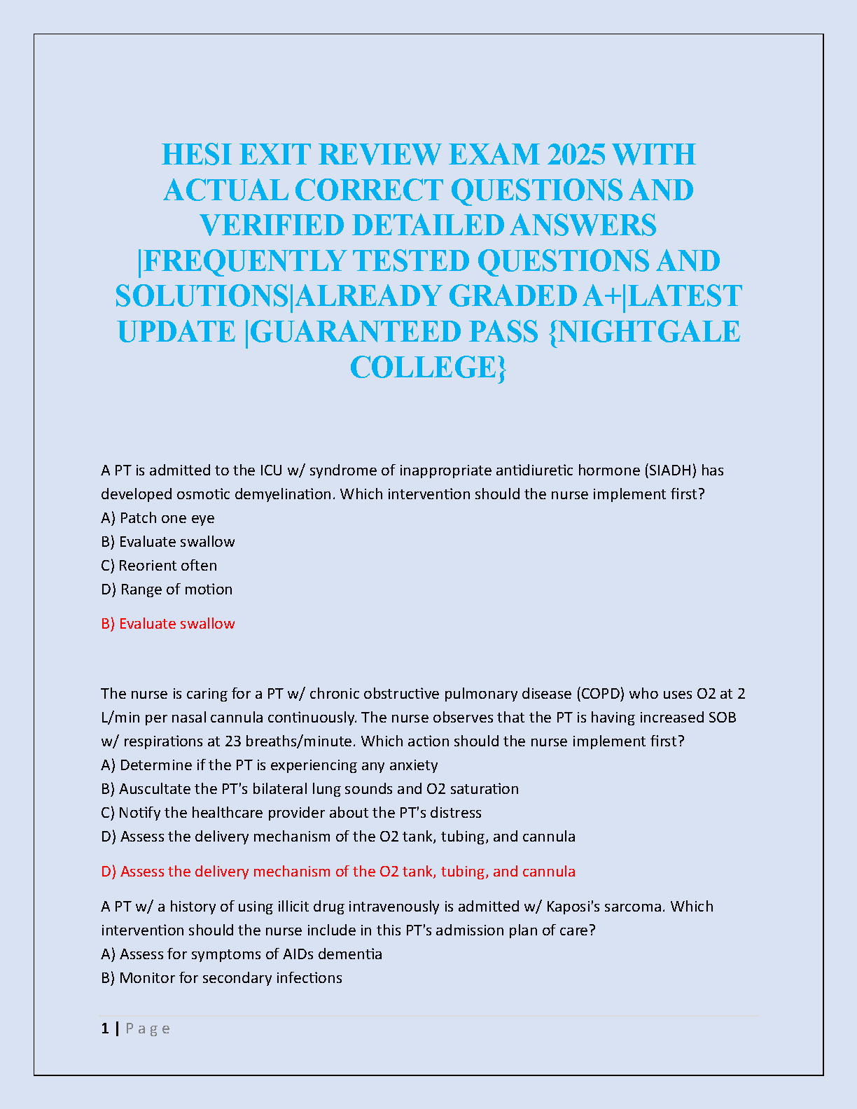 Prepare to excel in your nursing career with our ultimate study resource for the HESI Exit Exam 2025. This comprehensive test bank is meticulously designed to help you pass on your very first attempt, eliminating the stress of resits. Inside, you'll find a vast collection of frequently tested questions, each paired with a verified, detailed answer and rationale. This is the latest updated version, already proven to help students from schools like Nightingale College achieve an A+ grade. Covering critical nursing concepts, this guide provides the actual questions you need to study to walk into your exam with confidence. Secure your success and guarantee your pass with this essential HESI Exit review.