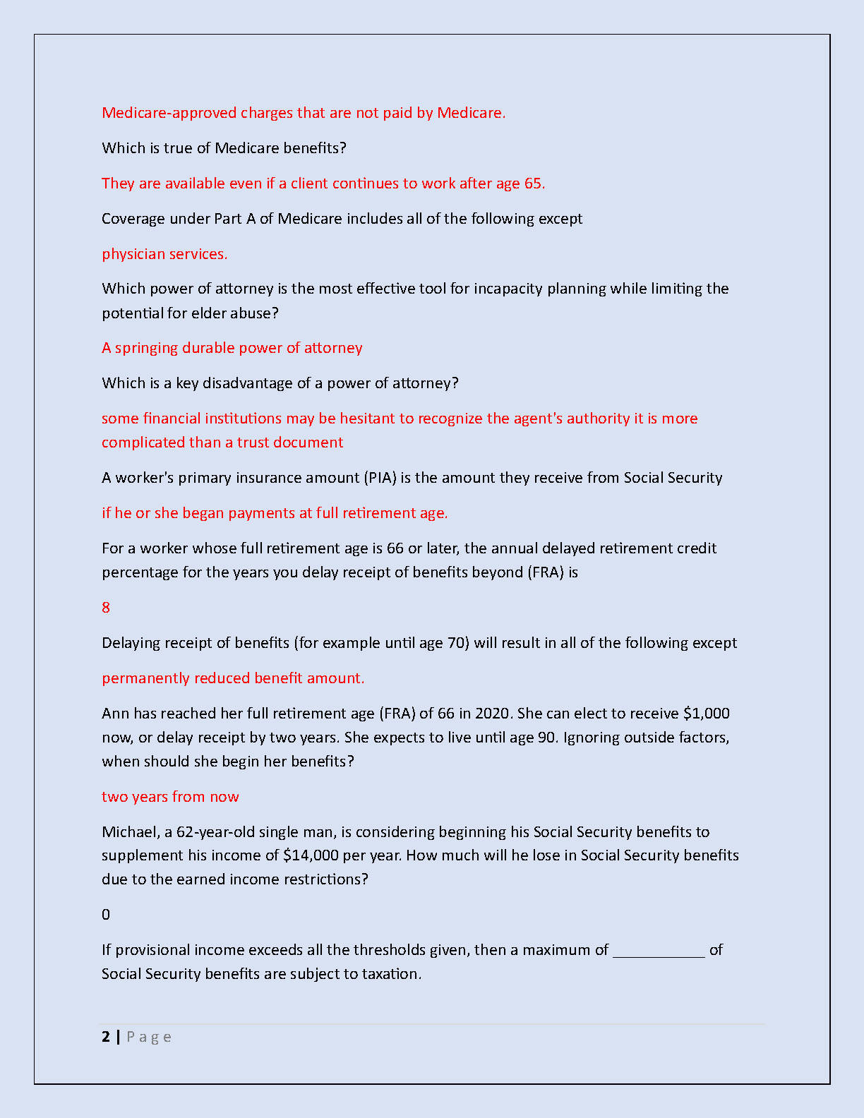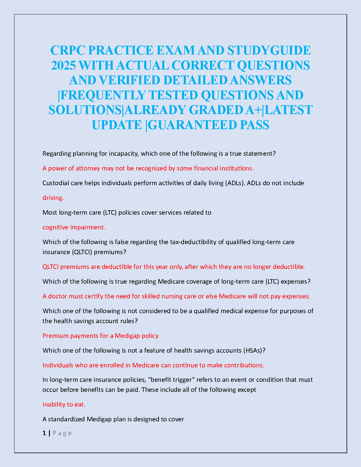 Master the 2025 Chartered Retirement Planning Counselor (CRPC) exam with this A+ graded test bank, fully updated for the latest College for Financial Planning curriculum. This guide features a comprehensive collection of frequently tested questions with verified, detailed answers and solutions, designed to guarantee you pass on your first try. Deepen your understanding of critical topics like long-term care, Medicare, HSAs, and retirement planning strategies. Get the ultimate exam prep tool and earn your CRPC designation with confidence.