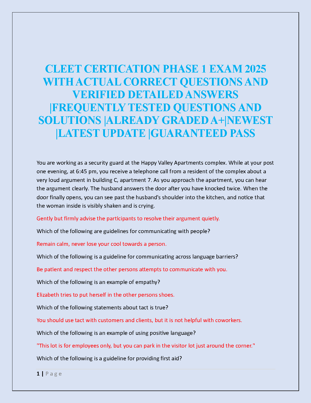 Prepare to ace your CLEET Certification Phase 1 Exam with our latest 2025/2026 test bank. This essential study guide is packed with actual, frequently tested questions and meticulously verified, A+ graded answers to ensure you pass on your first attempt. Covering crucial topics from real-world scenarios, communication, empathy, and first aid, this resource provides detailed solutions and rationales. Get the most up-to-date and reliable preparation tool to secure your certification and avoid resits. Guaranteed to help you succeed!