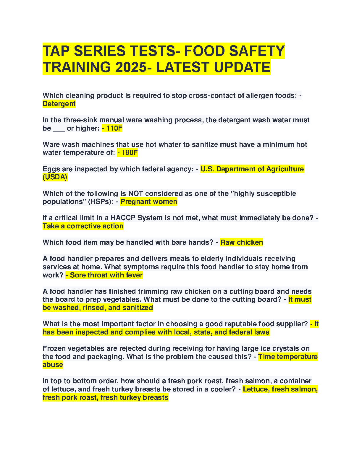 Get ready to ace your food safety certification with the latest 2025 Test Bank for the TAP Series Food Safety Training program. This comprehensive resource is packed with the most current questions and verified answers to ensure you're fully prepared. Master key concepts such as HACCP principles, proper sanitization temperatures, allergen control, and safe food handling practices. This Q&A guide is your ultimate tool to study effectively, build confidence, and pass your food safety exam on the first try. Don't leave your certification to chance—get the essential practice you need today!