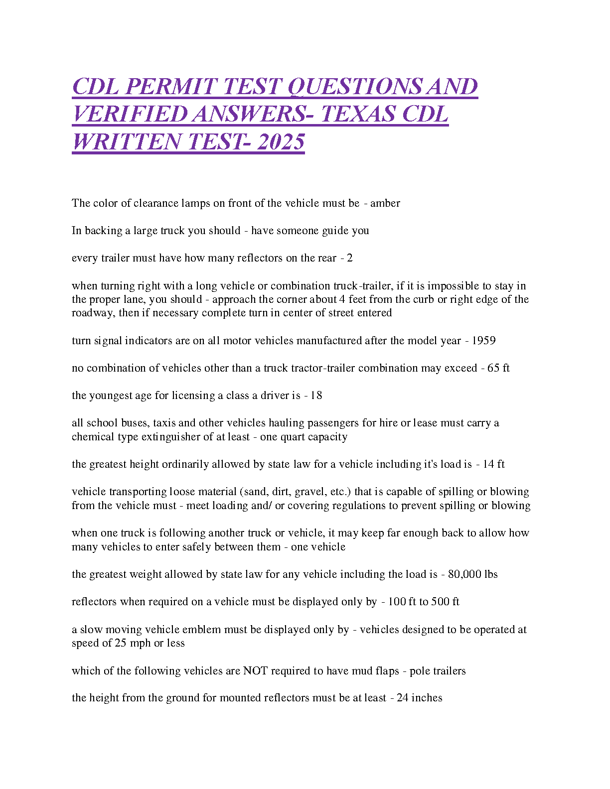Texas CDL Permit Written Test 2025: Verified Questions & Answers Study Guide to Pass on Your First Attempt