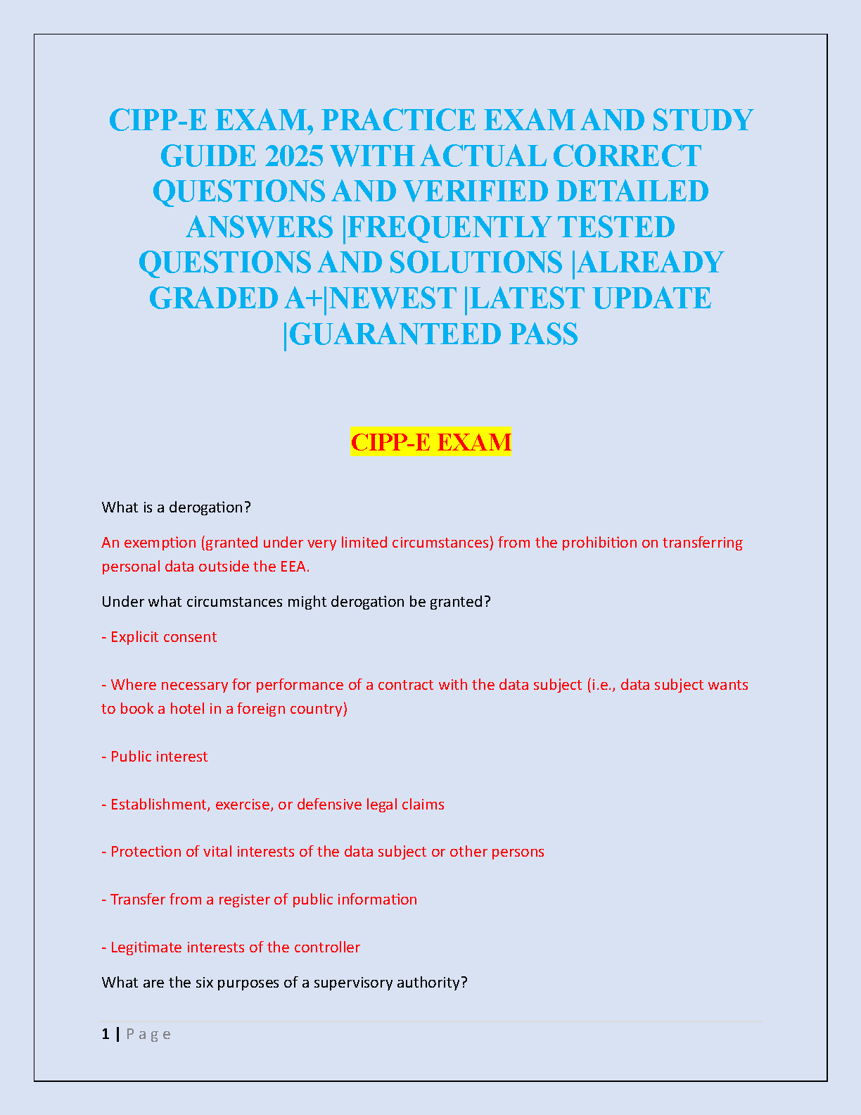 CIPP-E Certified Information Privacy Professional Europe 2025 Test Bank - Practice Exam Questions and Verified Answers