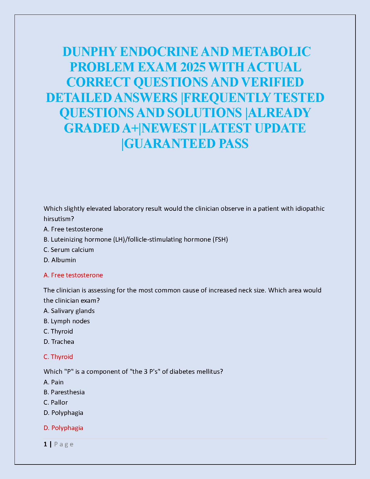 Unlock A+ results with the ultimate study resource for the Endocrine and Metabolic Problems chapter from Dunphy's 'Primary Care: The Art and Science of Advanced Practice Nursing,' 5th Edition. This 2025 updated test bank provides a complete set of frequently tested exam questions, each with verified correct answers and detailed solutions. Master key concepts, prepare effectively for your exams, and guarantee your success. This is the latest and most accurate guide to help you ace your course and pass on the first try.