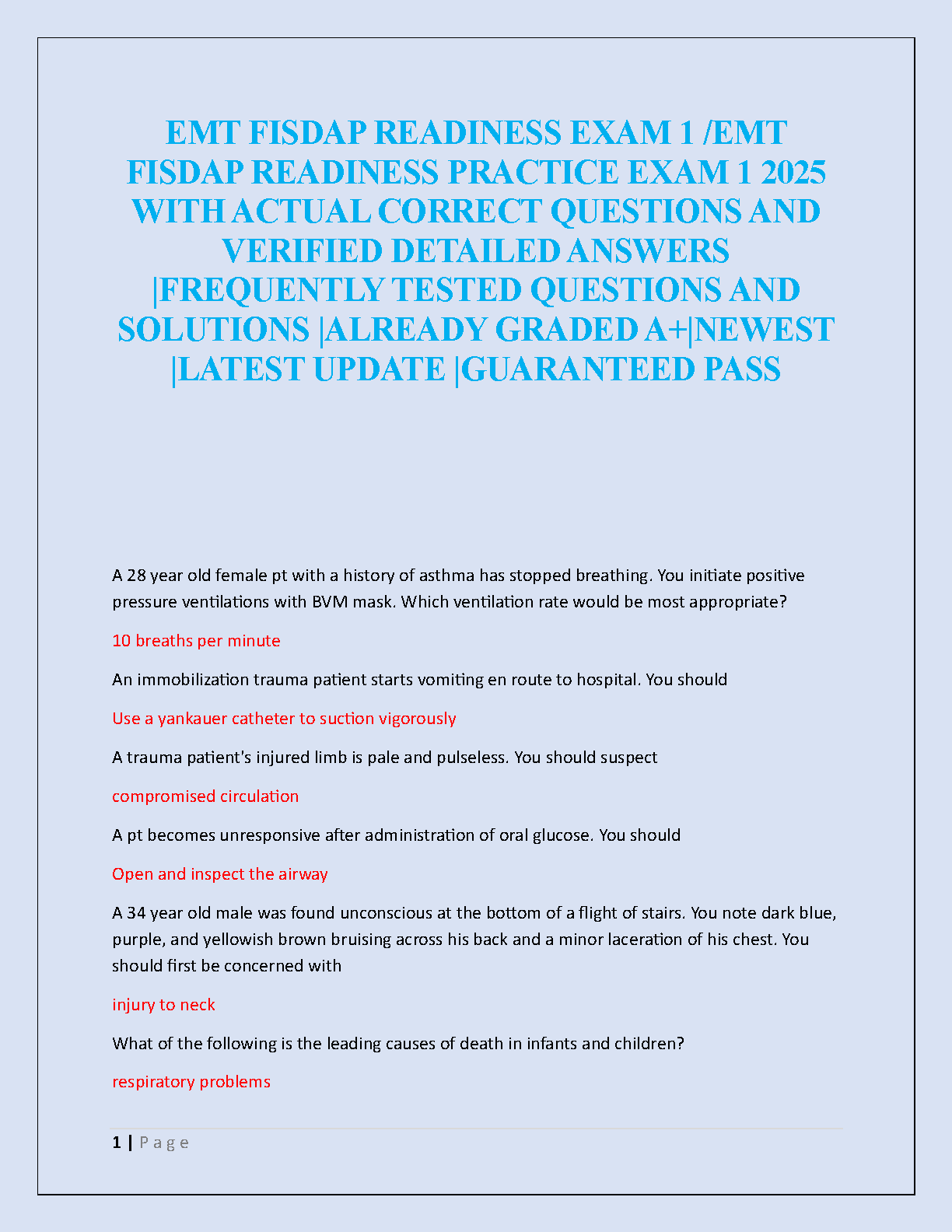Prepare to ace your EMT FISDAP Readiness Exam 1 with this comprehensive study guide, fully updated for the 2025/2026 academic year. This resource features a collection of actual, frequently tested questions paired with detailed, verified answers to ensure you master the material. Designed to help you pass on your first attempt and achieve an A+ grade, this guide covers essential EMT scenarios and critical knowledge areas. Stop worrying about resits and start studying with a proven tool for success. Get the latest update and guarantee your pass!