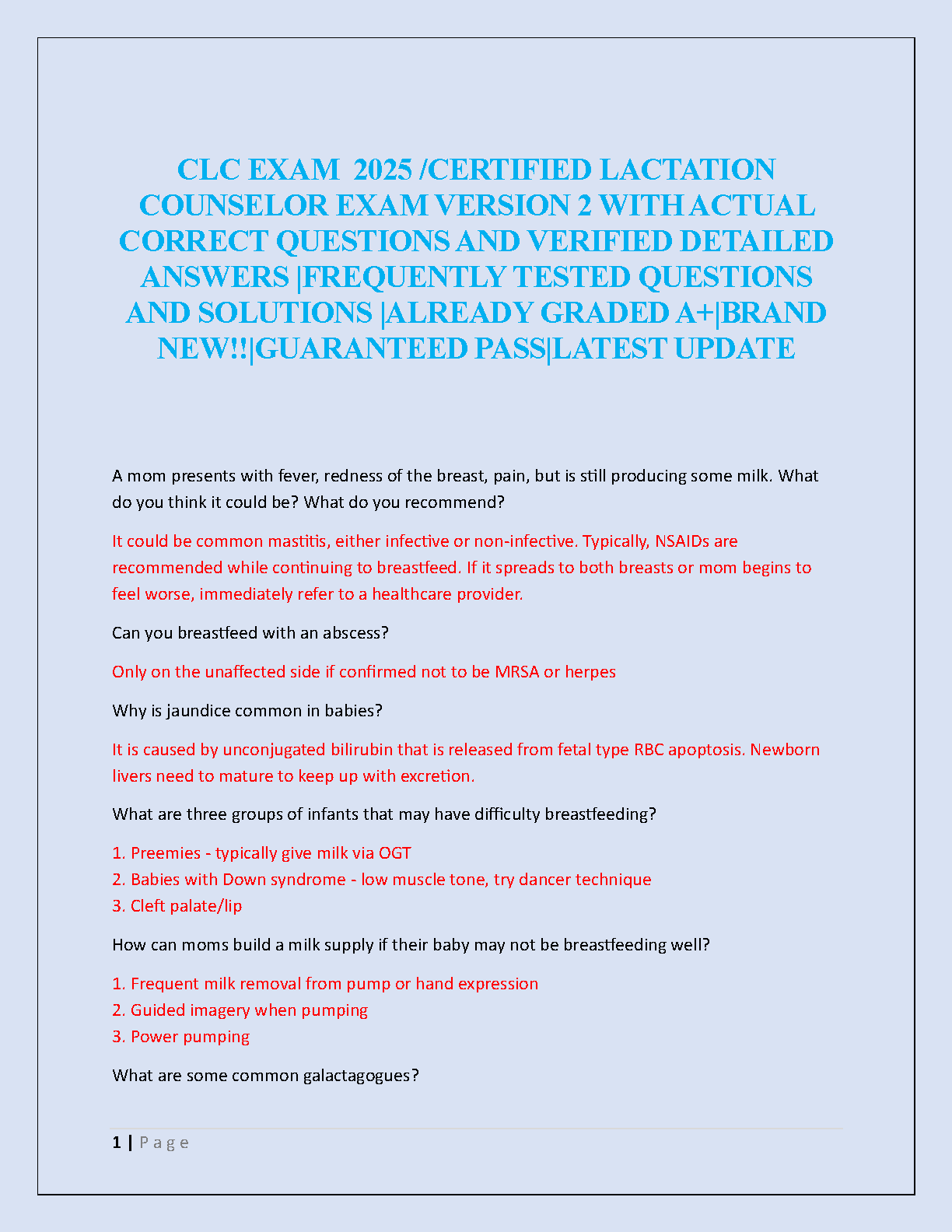 Prepare to excel in your Certified Lactation Counselor (CLC) exam with our comprehensive Version 2 study guide, fully updated for the 2025/2026 academic year. This guide provides a detailed compilation of frequently tested questions, each accompanied by a verified, in-depth answer and rationale. This resource has been A+ graded and is meticulously designed to cover critical topics you'll face on the exam, including mastitis, infant jaundice, breastfeeding challenges, and more. Stop worrying about resits—this guide is your ultimate tool to build confidence and achieve a guaranteed pass on your first attempt.