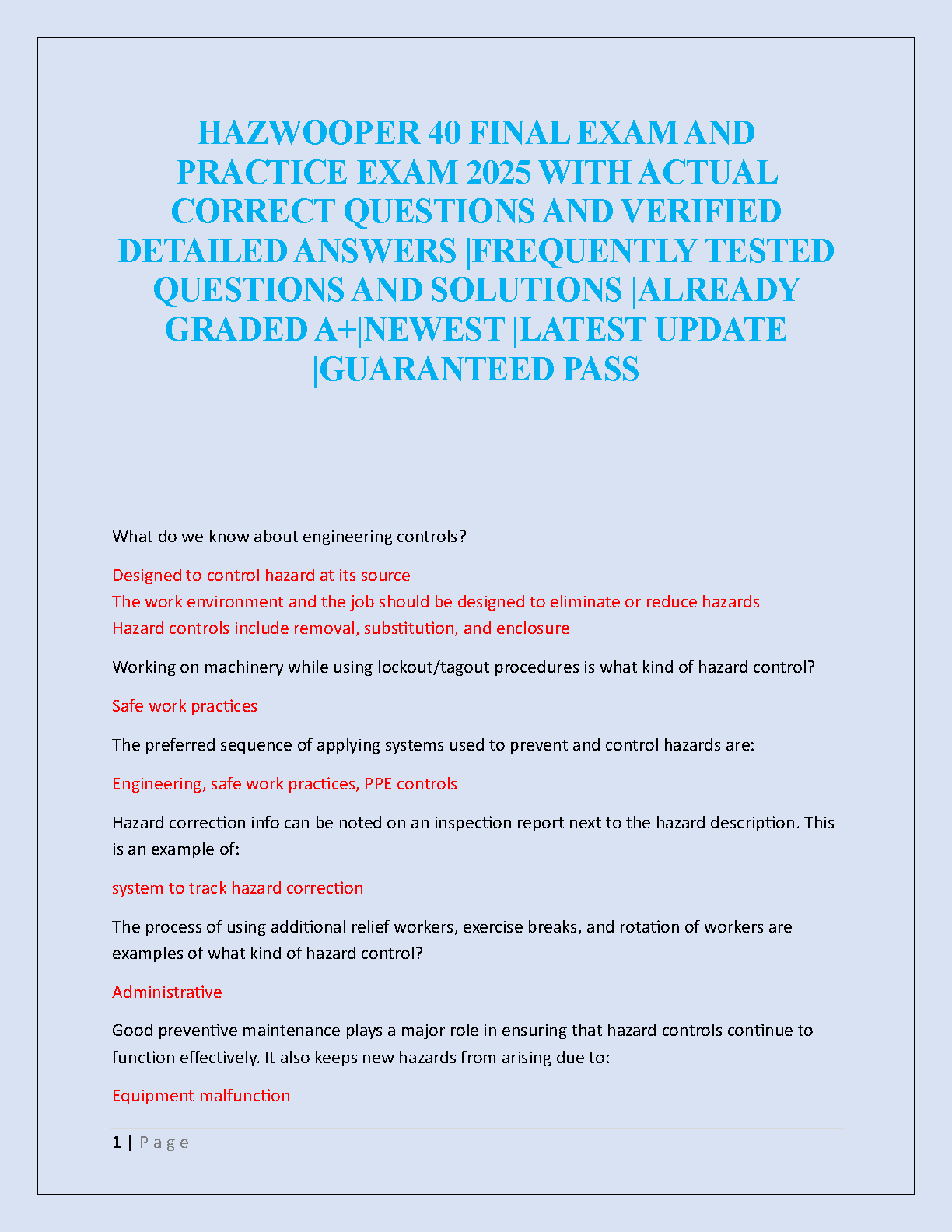 Master the HAZWOPER 40 certification with our ultimate 2025/2026 Final Exam Test Bank. This comprehensive resource is packed with actual, frequently tested questions and meticulously verified, detailed answers to ensure you're fully prepared. Covering all essential topics, including engineering controls, safe work practices, and hazard correction, this guide is designed to help you achieve an A+ grade. Our expertly compiled solutions guarantee a deep understanding of the material, helping you pass the exam on your first attempt with confidence. Get the latest and most accurate preparation tool to avoid resits and secure your HAZWOPER 40 certification.