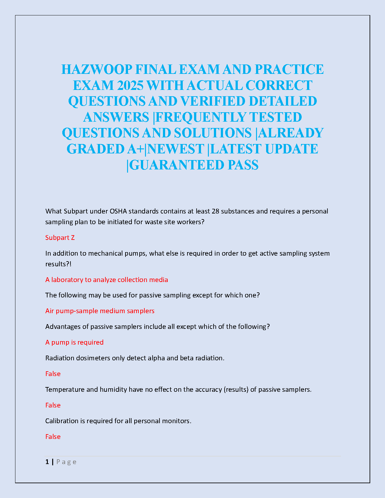 Ace your HAZWOPER Final Exam with our latest 2025 test bank. This comprehensive resource is packed with actual exam questions and verified, detailed solutions to ensure you're fully prepared. Covering frequently tested topics from OSHA standards like Subpart Z to sampling techniques, this study guide is designed to help you achieve an A+ grade and guarantee a pass on your first try. Don't leave your certification to chance—master the material with this up-to-date and essential exam preparation tool.