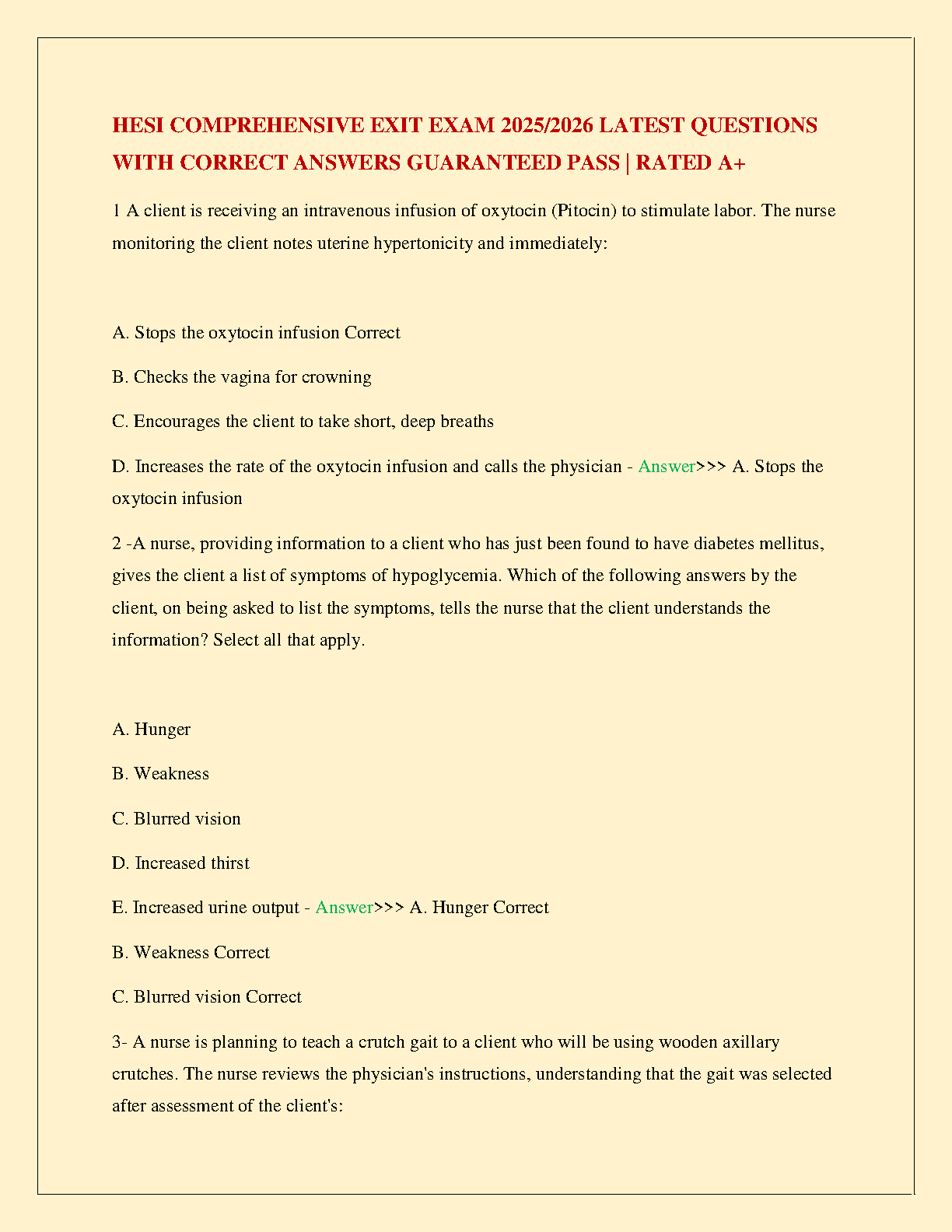 Prepare to excel on your nursing licensure exam with our latest HESI Comprehensive Exit Exam study guide for the 2025/2026 academic year. This essential resource is packed with the most current questions and meticulously verified answers, designed to ensure you pass with an A+ grade on your very first attempt. Our guide covers all critical nursing topics you'll encounter, providing the confidence and knowledge needed to succeed and avoid costly resits. Get instant access to the ultimate preparation tool and take the next step in your nursing career with confidence.