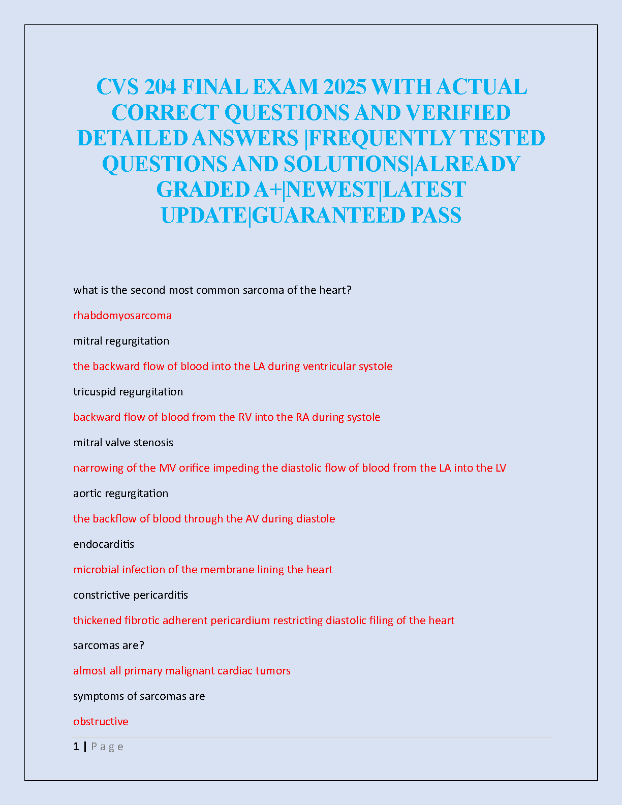 Unlock exam success with the latest 2025/2026 Test Bank for the CVS 204 Final Exam. This comprehensive resource is expertly designed to help you ace your cardiovascular system course. It features a complete collection of frequently tested questions, each with a verified, detailed answer and rationale. Our study guide is already proven to help students achieve A+ grades, providing the confidence you need to pass on your first attempt and avoid costly resits. Instantly download this essential tool and master complex topics like mitral regurgitation, endocarditis, and cardiac sarcomas. Prepare smarter, not harder, and guarantee your pass!