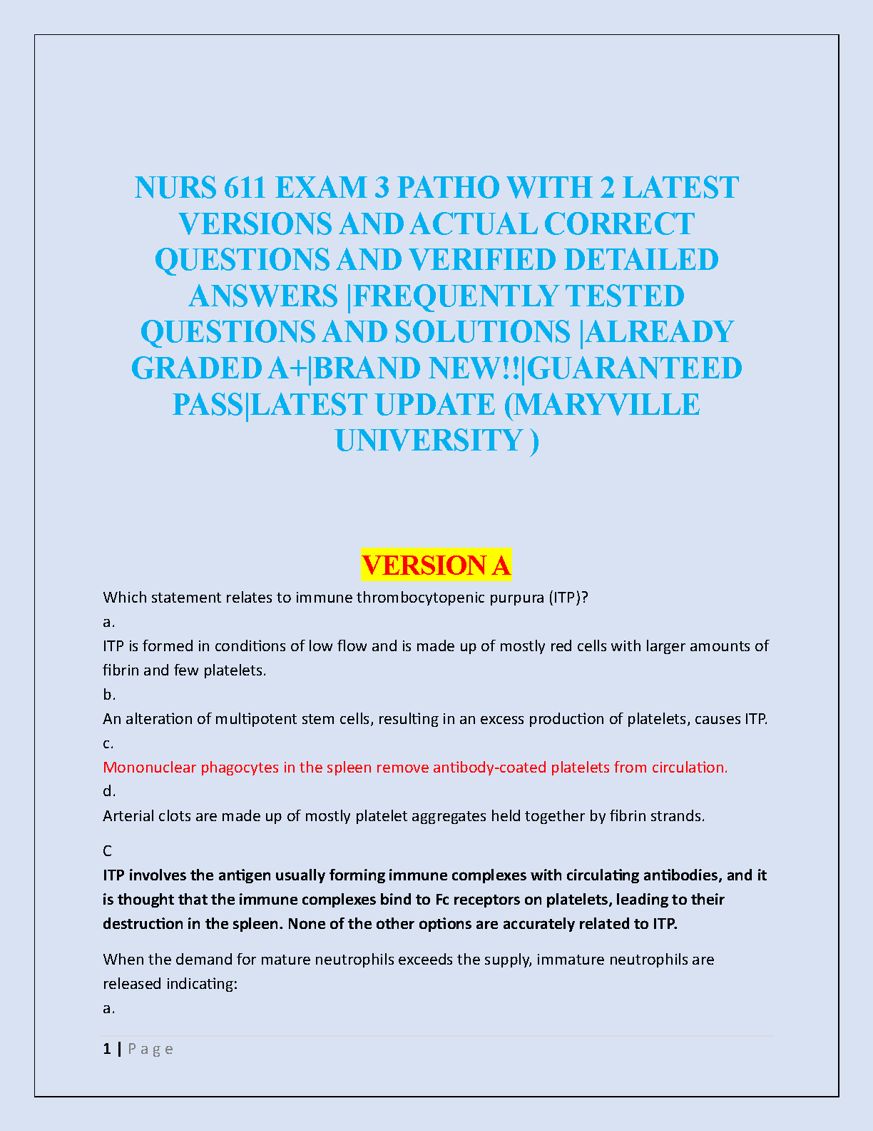 NURS 611 Exam 3 Pathophysiology Test Bank | Maryville University | 2 Latest Versions with Verified Questions and A+ Graded Answers