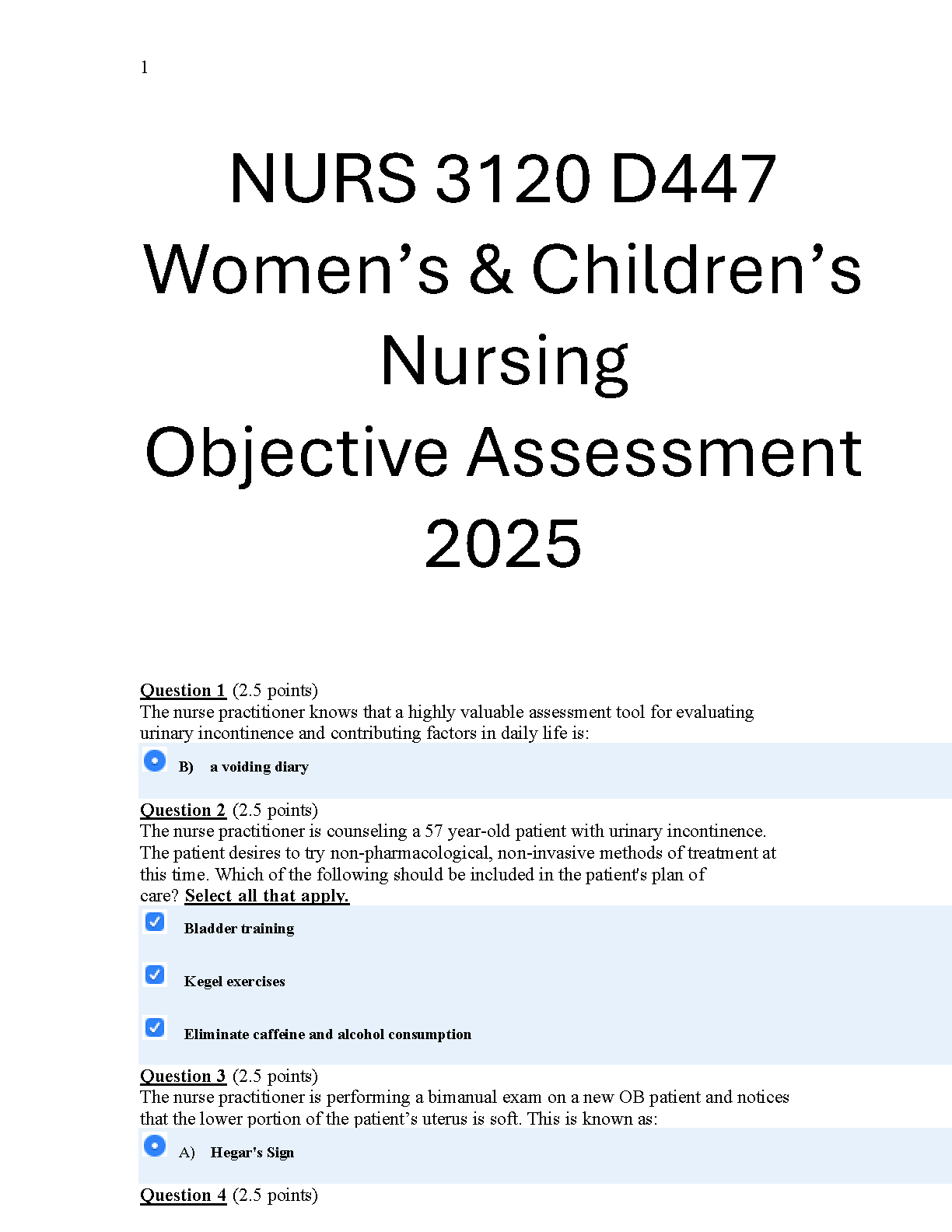 Get ready to ace your exams with the latest 2025/2026 Test Bank for NURS 3120 D447: Women's & Children's Nursing. This comprehensive resource contains a complete collection of objective assessment questions, each with verified answers. Designed to help you master crucial topics and pass your exam on the first attempt, this study guide is your key to avoiding resits and achieving academic success. Download now to start studying smarter and boost your confidence in Women's and Children's Nursing.