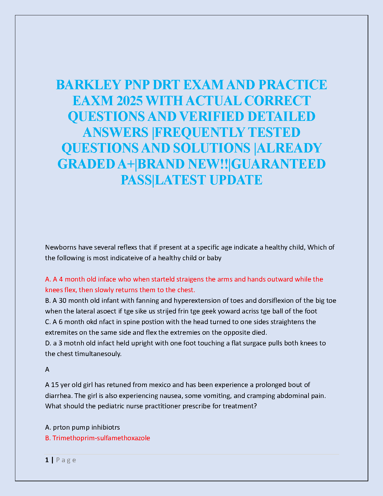 Ace your Pediatric Nurse Practitioner Diagnostic Readiness Test (PNP DRT) with our latest 2025 test bank, expertly curated from the renowned Barkley review materials by Thomas W. Barkley, Jr. This comprehensive resource is packed with a vast collection of actual exam questions and meticulously verified, detailed answers. Achieve a grade of A+ and pass your certification on the first attempt. Our test bank covers all essential topics with frequently tested questions and solutions, ensuring you are fully prepared. This brand-new, updated guide is guaranteed to boost your confidence and secure your success.