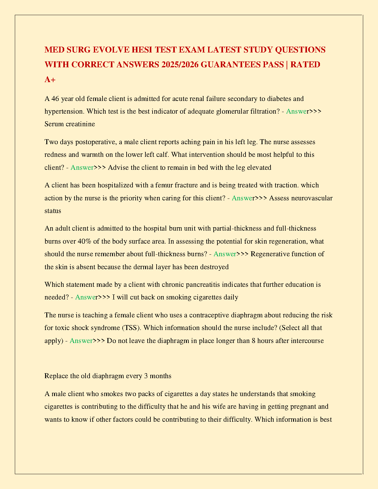 Master the HESI Med-Surg exam with our latest 2025/2026 test bank! This comprehensive study guide features a wide array of practice questions with 100% correct, verified answers. Covering crucial topics seen in the document like renal failure, postoperative complications, burn care, and pancreatitis, this resource is designed to mirror the actual HESI exam format. Prepare effectively, build confidence, and secure an A+ on your first attempt. Perfect for nursing students aiming to excel in their medical-surgical course and pass their HESI specialty exam with ease.