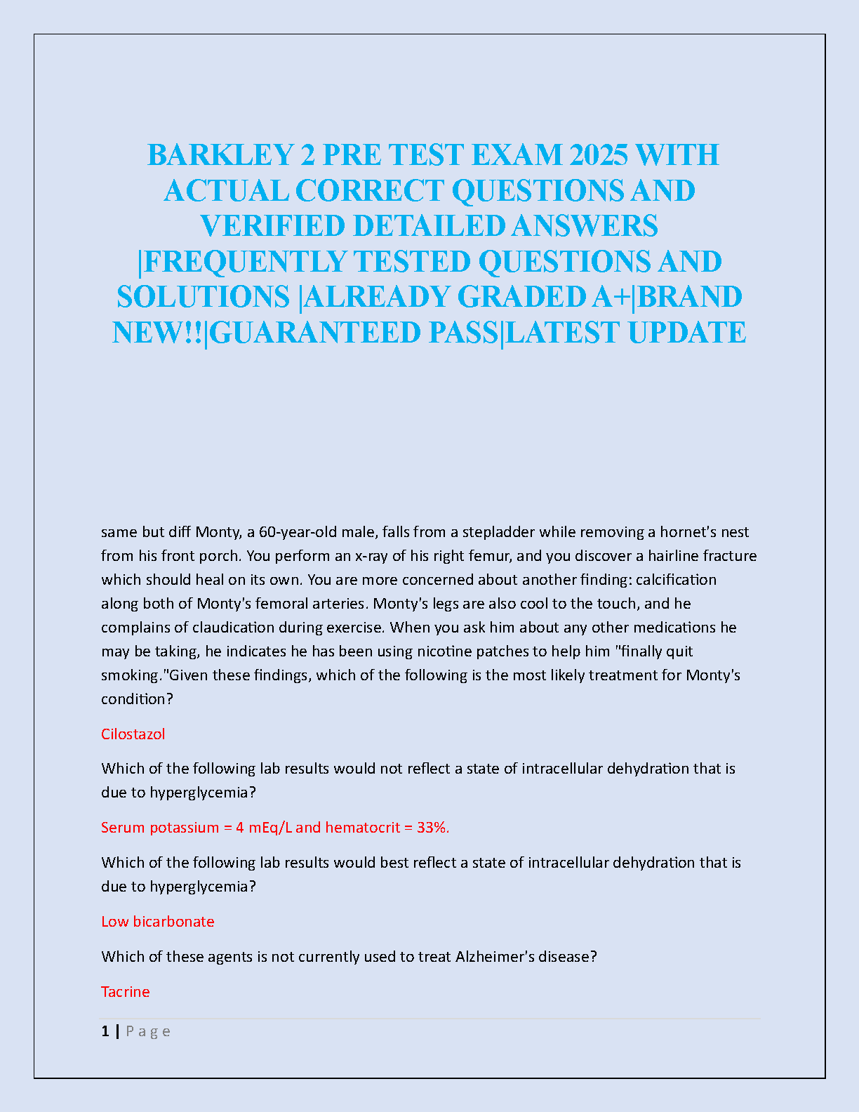 Achieve top scores on your Nurse Practitioner certification exam with our comprehensive test bank for the Barkley & Associates Pre-Test Exam 2, updated for 2025. This essential study guide features a complete collection of actual exam questions, each accompanied by verified, in-depth answers and rationales. Master frequently tested concepts and walk into your exam with the confidence to pass on your first attempt. This A+ graded resource is your key to success.
