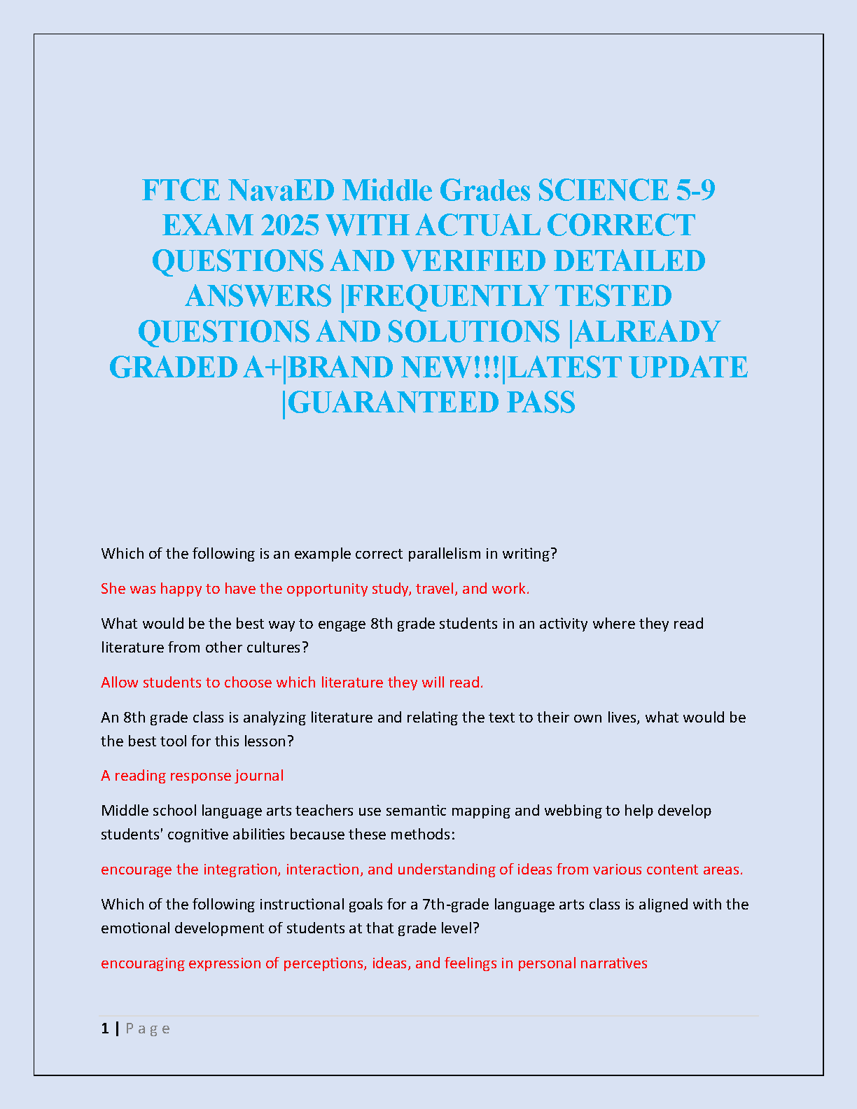 Ace the FTCE Middle Grades Science 5-9 exam on your first try with the brand new 2025 Test Bank from NavaED. This ultimate study resource is packed with actual, frequently tested exam questions and comprehensive, verified answers. Designed for the 2025/2026 academic year, this guide provides the detailed solutions you need to understand key concepts and secure an A+ grade. Stop worrying about resits—this test bank is your key to a guaranteed pass and a successful teaching career in Florida.