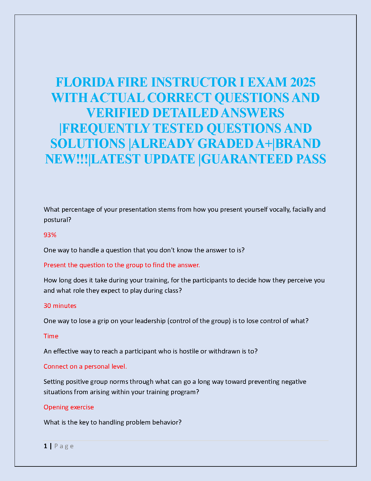 Ace your Florida Fire Instructor I certification with our definitive 2025 exam test bank. This comprehensive resource is packed with actual, frequently tested questions and meticulously verified answers, ensuring you study the most relevant material. Designed for a guaranteed pass, our guide has already been graded A+ for accuracy and effectiveness. Get the latest updated content and master the concepts needed to succeed on your first attempt. Stop worrying about resits and start your journey to becoming a certified Fire Instructor today with this essential study tool.