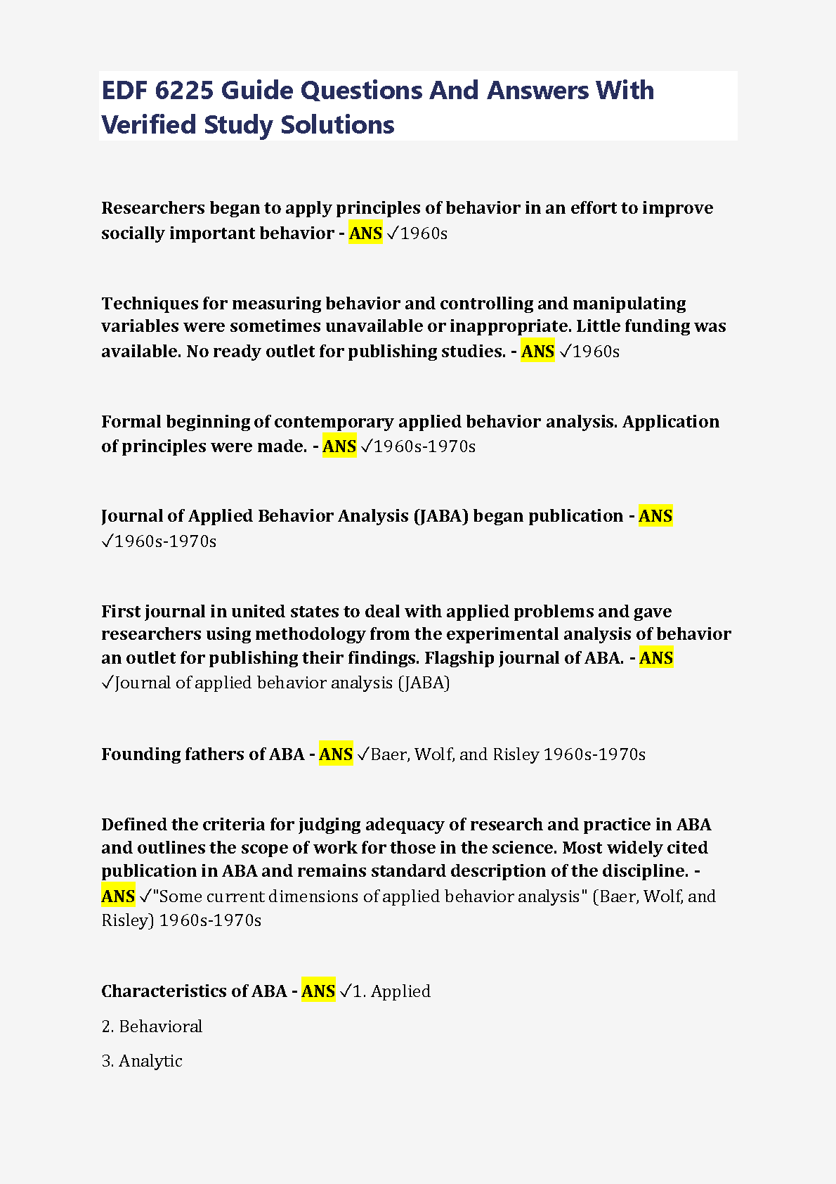 Ace your EDF 6225 course with this ultimate study resource. This test bank for Foundations of Applied Behavior Analysis provides a complete set of guide questions paired with expertly verified answers and solutions. Updated for the 2025/2026 academic year, this guide is meticulously designed to cover all key topics, helping you master the material efficiently. Prepare for your exams with confidence and secure a top grade on your first try. Avoid resits and deepen your understanding of ABA principles with these proven study solutions.