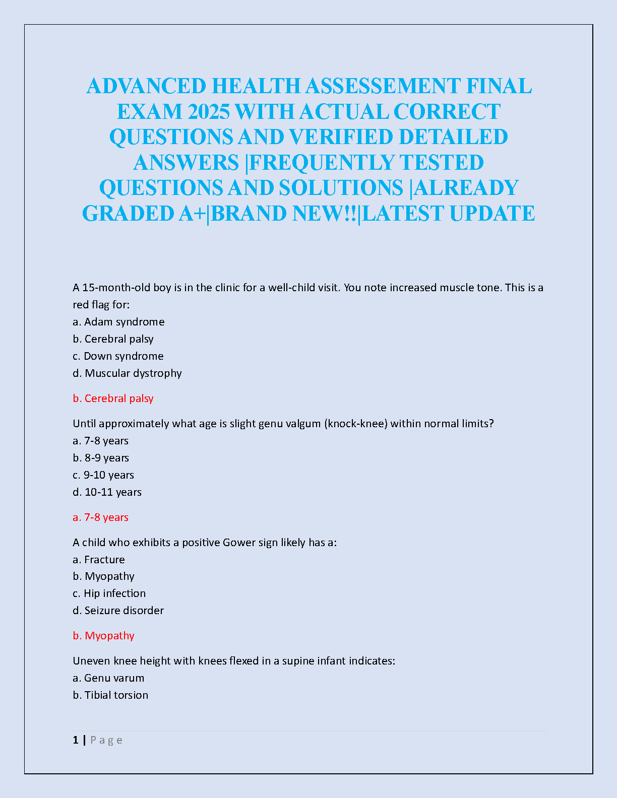 Ace your Advanced Health Assessment final exam with this comprehensive 2025-2026 test bank! This brand-new resource is packed with a wide range of frequently tested questions and meticulously verified, detailed answers, designed to mirror the actual exam format. It's already been A+ graded, ensuring you're studying the most accurate and relevant material. Master complex concepts, from pediatric assessments to differential diagnoses, and gain the confidence to pass on your first attempt. Stop stressing about resits and secure your top grade today.