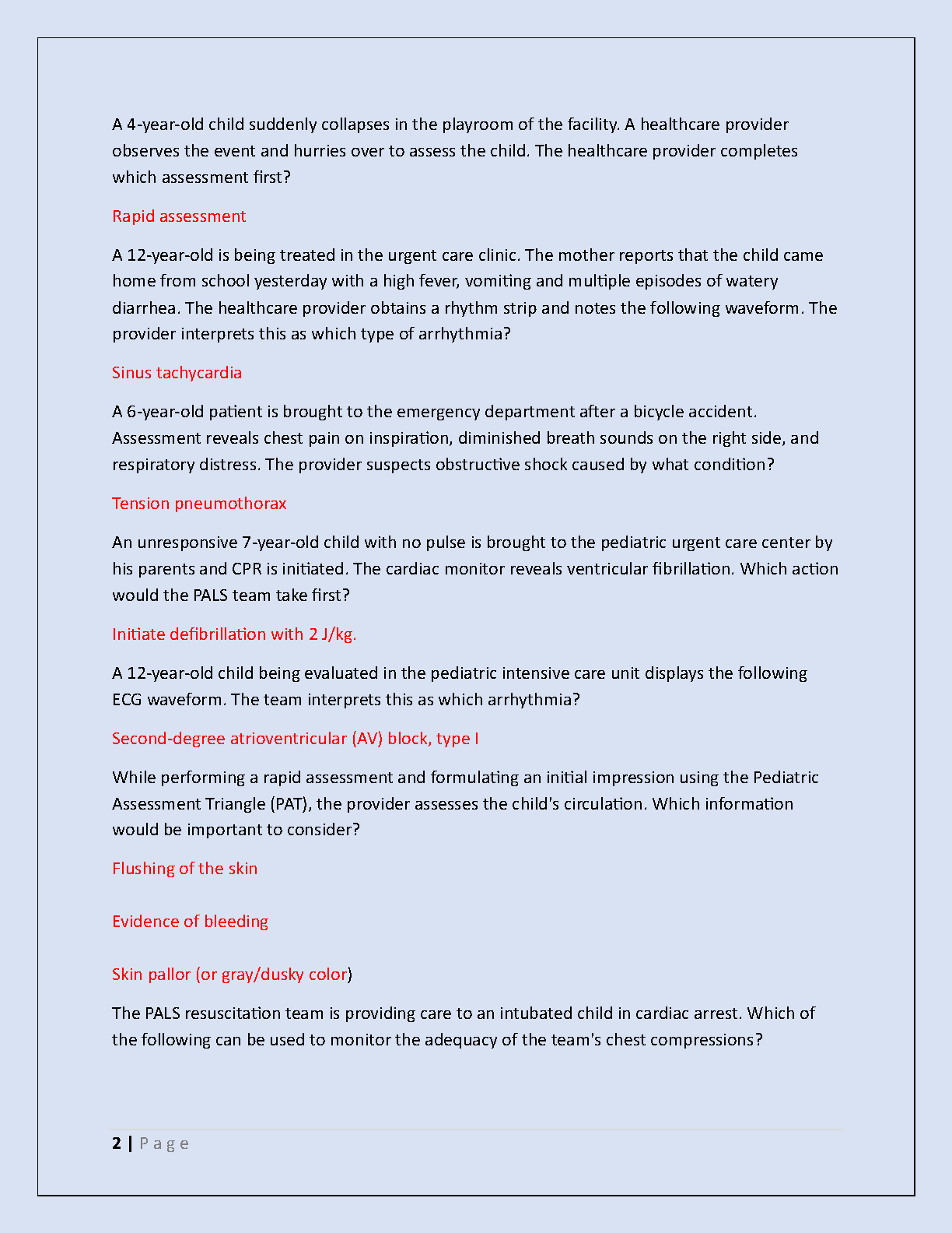 Excel in your Pediatric Advanced Life Support (PALS) certification with our definitive 2025/2026 test bank, meticulously designed to ensure you pass on your first attempt. This comprehensive resource features a collection of the latest, frequently tested exam questions complete with verified, detailed answers and solutions. Covering all critical PALS concepts, from recognizing shockable rhythms like pVT and VF to post-cardiac arrest care and using the Pediatric Assessment Triangle (PAT), this guide is your key to mastering the material. Based on the latest American Heart Association (AHA) guidelines, this A+ graded study tool is brand new and fully updated to reflect the current PALS exam format, helping you avoid resits and achieve certification with confidence.