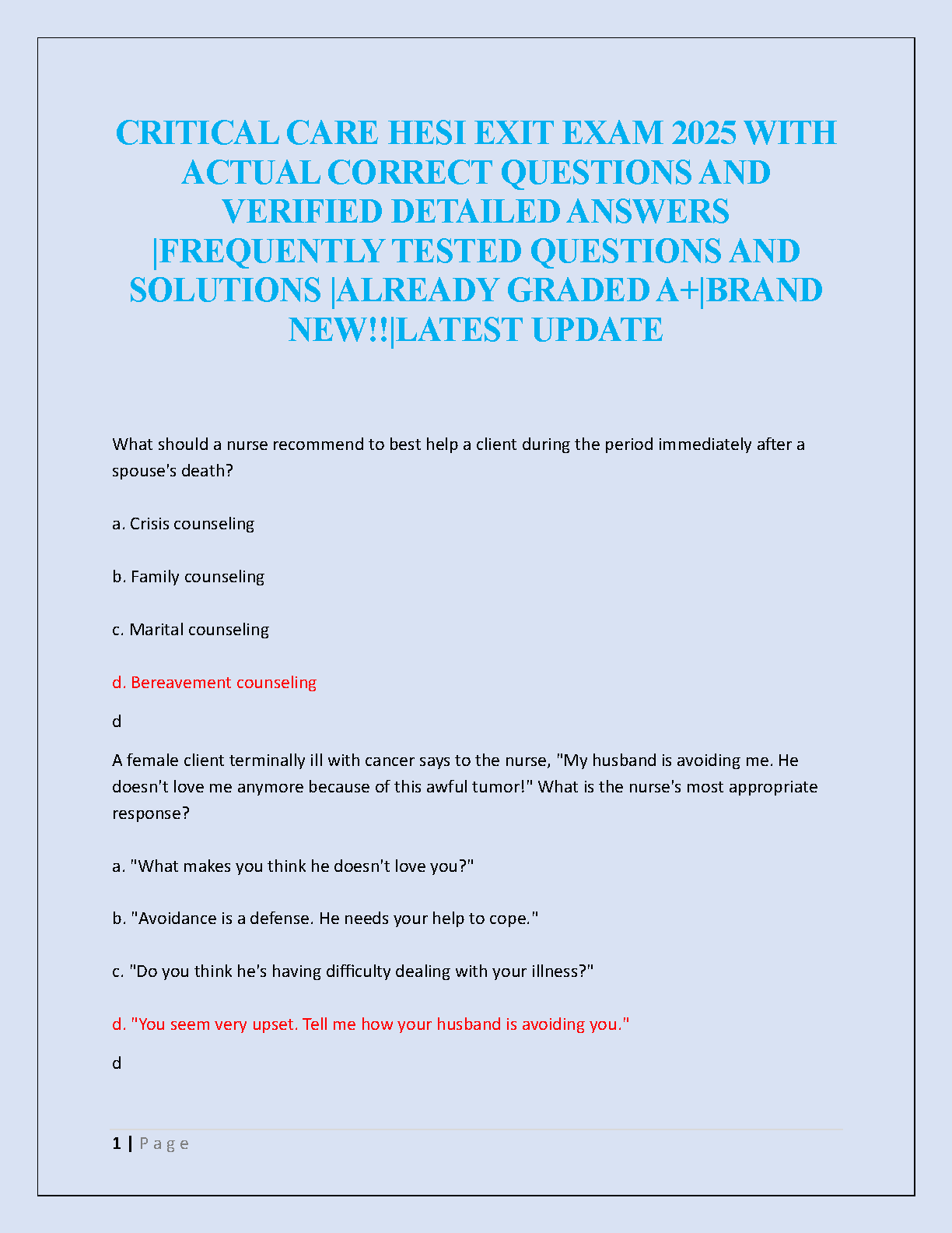 Ace your upcoming HESI Exit Exam with our comprehensive 2025 Critical Care Test Bank. This essential study guide features a complete collection of frequently tested questions, each paired with a verified, detailed answer and rationale. Designed to ensure you grasp critical concepts, this A+ graded resource is your ultimate tool for passing the exam on your first try. Get the latest, most accurate content and walk into your exam with confidence.
