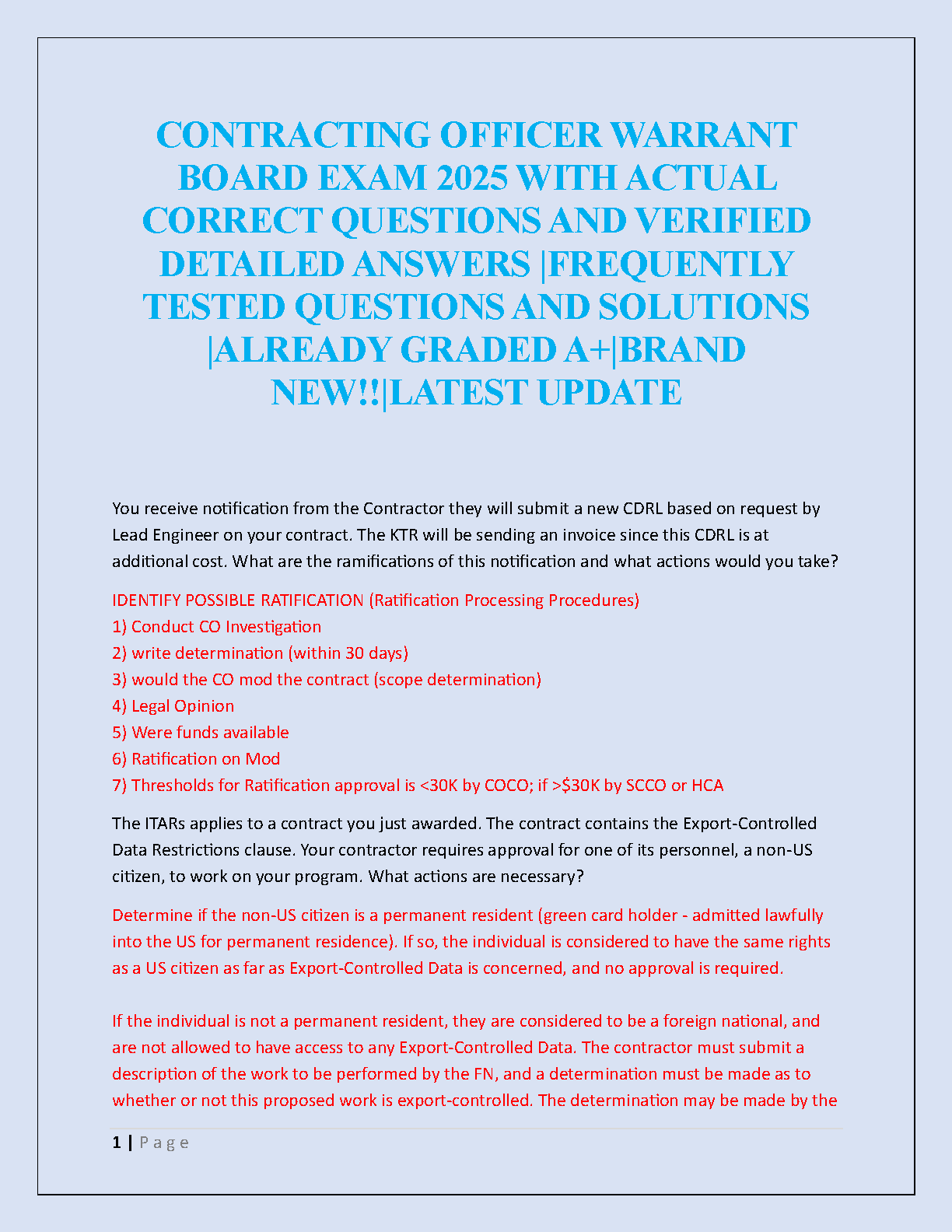 Ace your Contracting Officer Warrant Board Exam in 2025 with our comprehensive test bank. This guide is packed with actual, frequently tested questions and meticulously verified, detailed answers. Achieve an A+ grade with this brand-new, latest update, designed to give you the confidence and knowledge to pass on your first attempt. Covering crucial topics like ratification procedures and ITARs, this resource is your key to success in securing your contracting officer warrant.