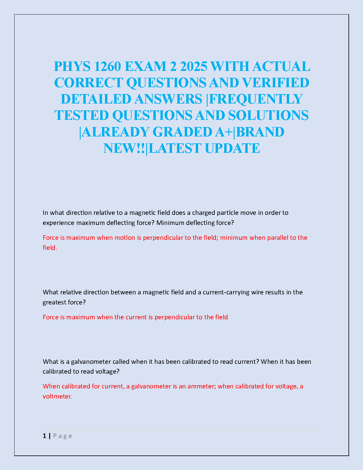 Prepare to ace your PHYS 1260 Exam 2 with our newly updated 2025/2026 Test Bank. This essential study guide features a comprehensive collection of actual exam questions paired with expertly verified, detailed answers and solutions. Covering all key topics, including magnetic fields, forces on charged particles, and current, this resource is meticulously designed to help you master the material, boost your confidence, and pass your exam on the first try. Say goodbye to exam stress and resits—our A+ graded material provides the ultimate preparation for success.