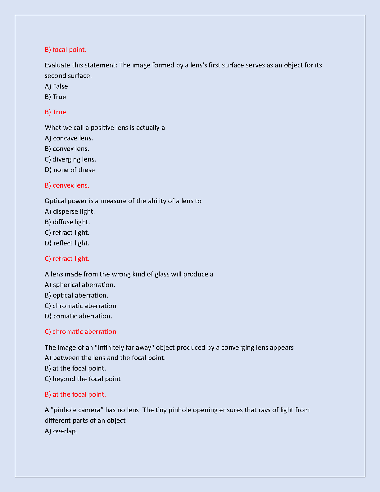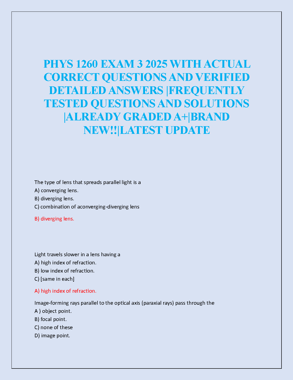 Ace your PHYS 1260 Exam 3 with this brand new, A+ graded test bank for the 2025 academic year. This resource is packed with a comprehensive collection of frequently tested questions, complete with detailed, verified answers and solutions. Covering key topics like lenses, refraction, and optics, this guide is expertly designed to help you master the material, understand the concepts, and pass your exam on the first try. Say goodbye to exam stress and resits by studying with the most up-to-date and accurate questions available.