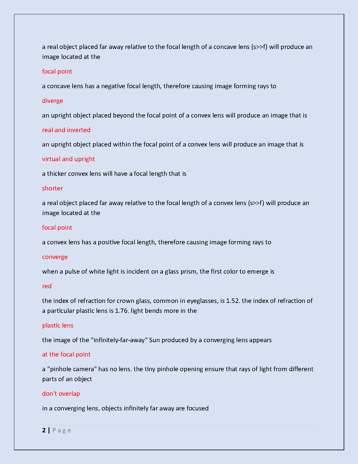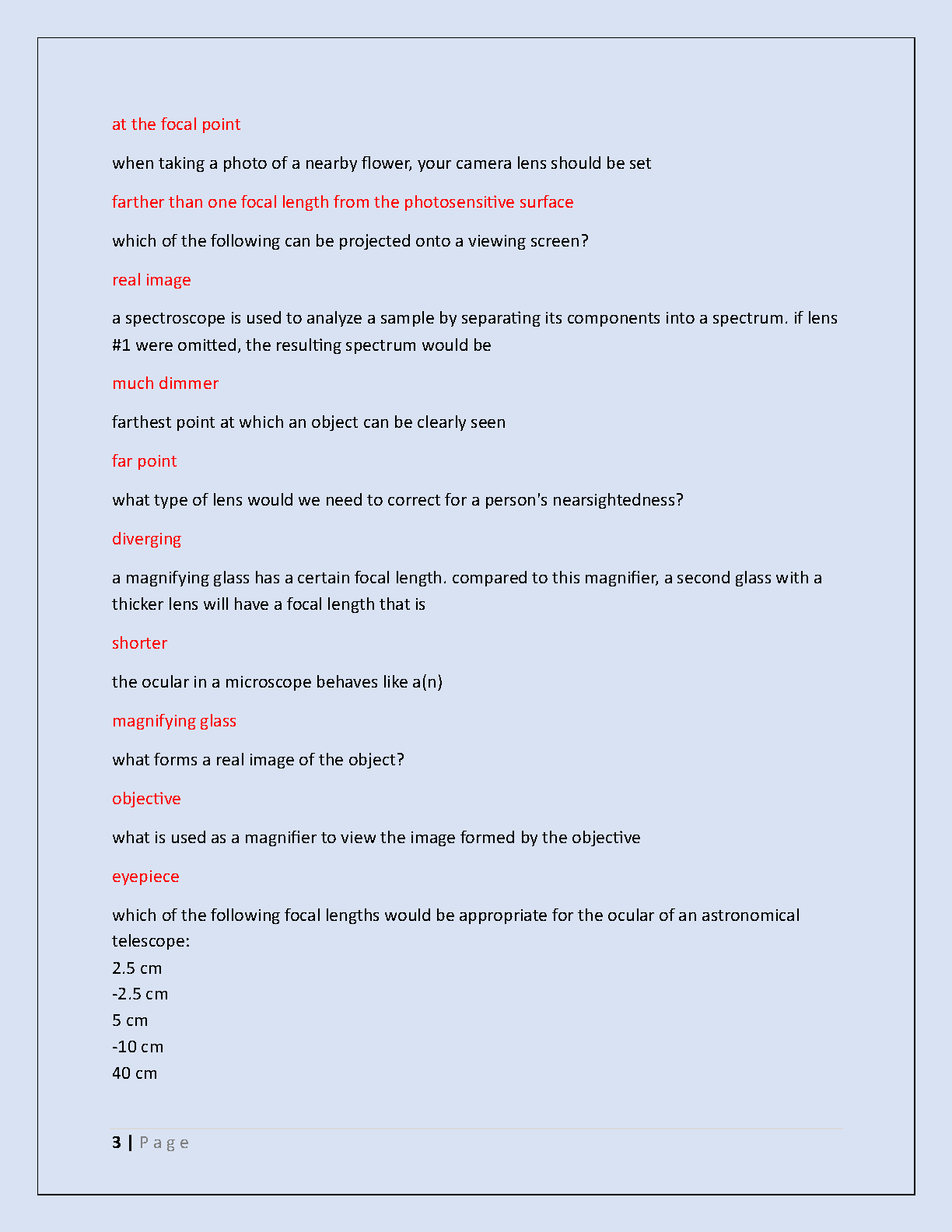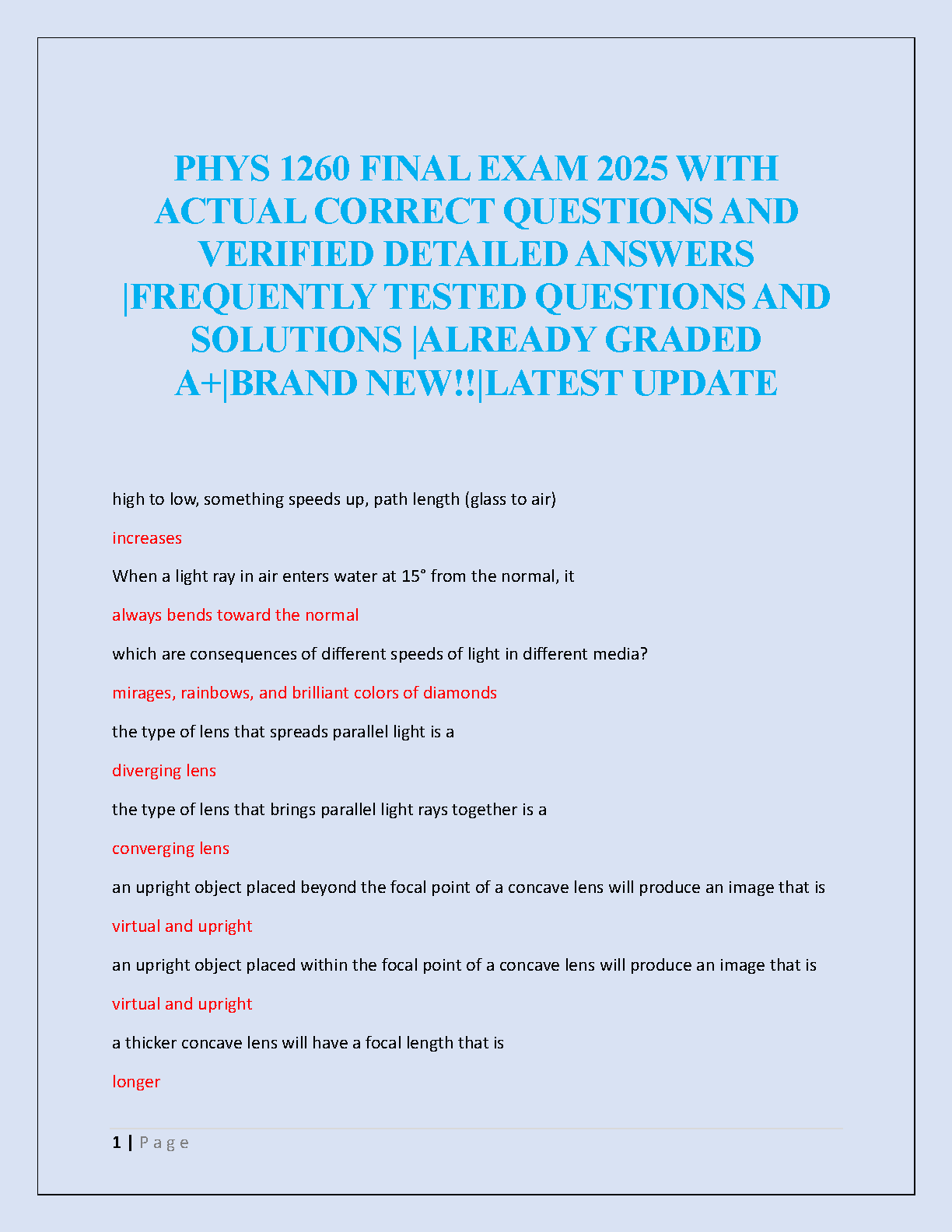 Master your PHYS 1260 Final Exam with our latest A+ graded test bank for 2025. This comprehensive study guide features a complete collection of actual exam questions, all with verified and detailed answers. Designed to help you pass on your first attempt, this resource covers all essential topics, including light refraction, dispersion, and the properties of converging and diverging lenses. Stop cramming and start studying smarter with these frequently tested questions and solutions to secure your A+ and avoid any resits.