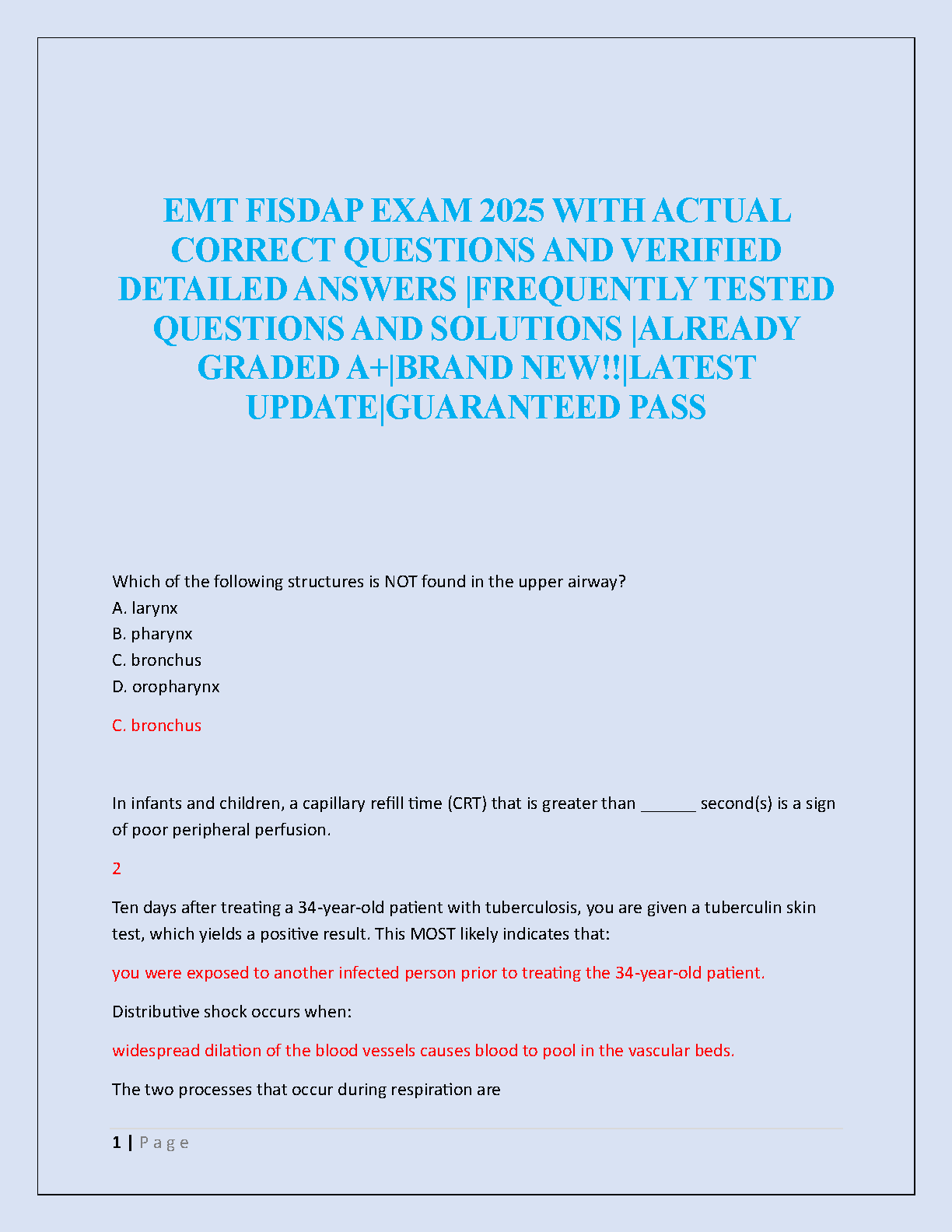 Ace your EMT FISDAP exam on the first try with our latest 2025/2026 study guide! This comprehensive resource is packed with actual exam questions and meticulously verified answers, covering all the frequently tested topics. Designed to help you achieve an A+ grade, this guide provides the detailed solutions and up-to-date content you need to feel confident on test day. Stop worrying about resits and secure your success with this guaranteed pass solution.