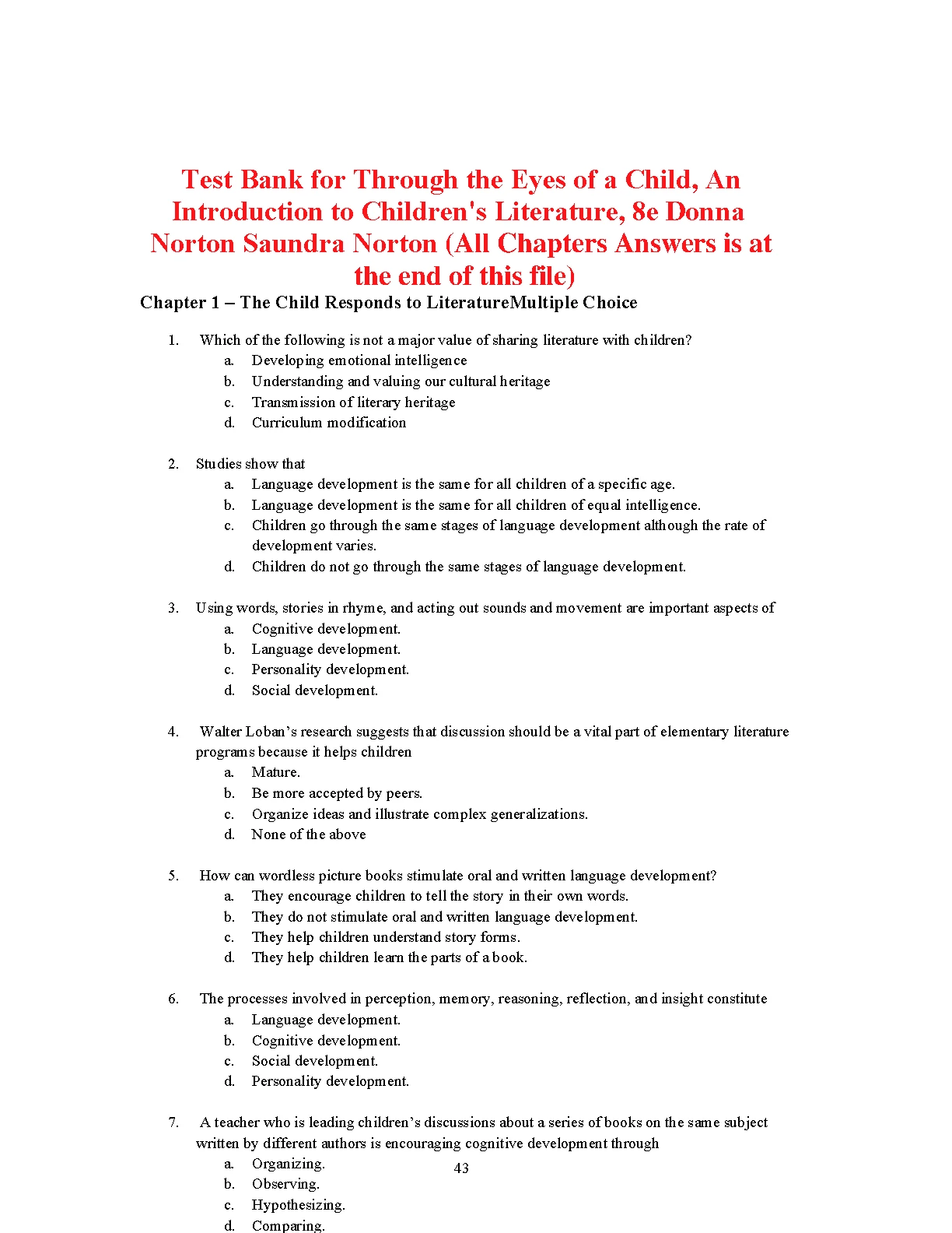 Test Bank for Through the Eyes of a Child, An Introduction to Children's Literature, 8TH EDITION BY Donna Norton Saundra Norton (All Chapters)