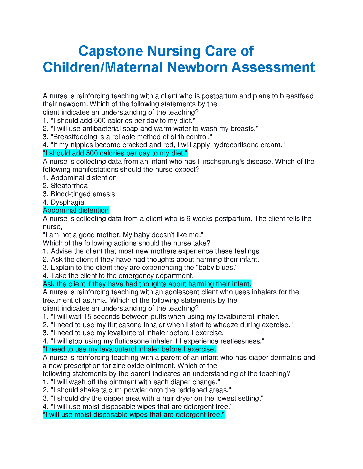 Ace your final nursing exams with this comprehensive test bank for Maternal Child Nursing Care, 7th Edition by Perry et al. This essential study resource focuses on Capstone-level assessment of Children and Maternal/Newborn care. It features a wide range of practice questions, complete with answers, covering critical topics such as postpartum care, newborn conditions like Hirschsprung's disease, pediatric asthma management, and common infant ailments. Perfect for students preparing for their capstone projects, final exams, or the NCLEX, this test bank provides the targeted practice you need to master the material and succeed.