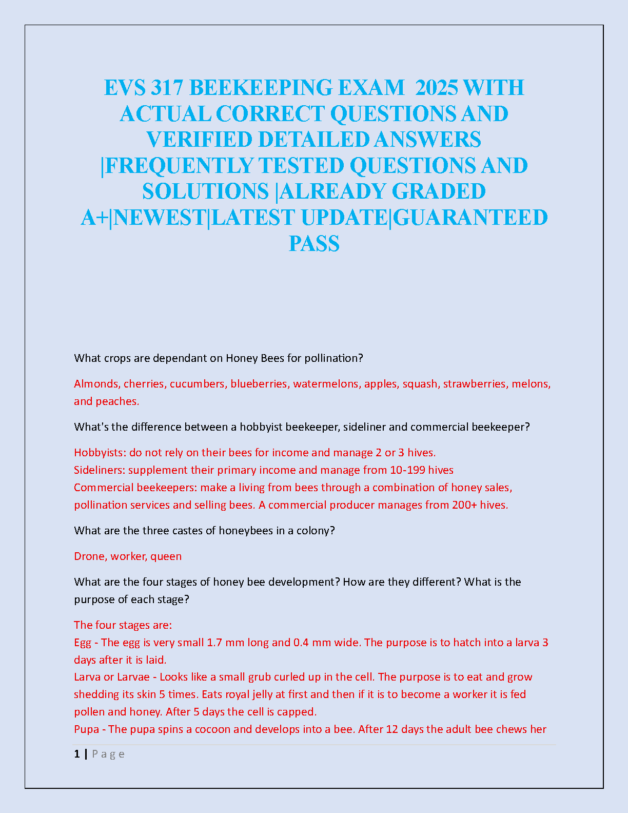 Master the essentials of beekeeping and ace your EVS 317 exam with our comprehensive test bank for the 2025-2026 academic year. This meticulously compiled resource features a collection of actual, frequently tested exam questions, each paired with a detailed, verified answer. Explore key topics including the vital role of honey bees in crop pollination, the distinctions between hobbyist, sideliner, and commercial beekeepers, the three castes within a colony (drone, worker, queen), and the four stages of honey bee development. Our test bank is already graded A+, ensuring you study with the most accurate and reliable information. It's the ultimate study tool designed to help you understand the core concepts, avoid resits, and pass your exam with confidence on the very first attempt. Get the latest update and guarantee your success in EVS 317 Beekeeping!