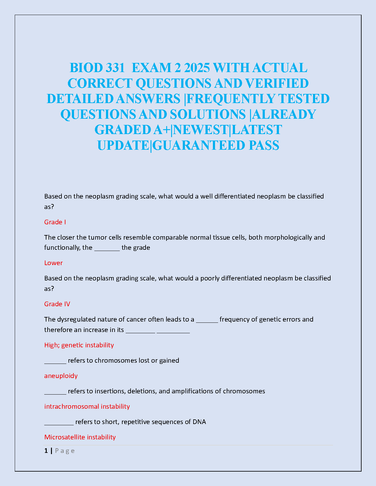 Ace your BIOD 331 Exam 2 with our latest 2025 test bank, expertly compiled to guarantee your success. This comprehensive study guide features a full range of frequently tested questions, each with detailed, verified answers and solutions. Dive deep into complex topics like neoplasm grading, genetic instability, and chromosomal abnormalities. Designed to help you achieve an A+ grade, this resource is your ultimate tool for passing on the first attempt and avoiding resits. Download now for immediate access to the materials you need to excel!