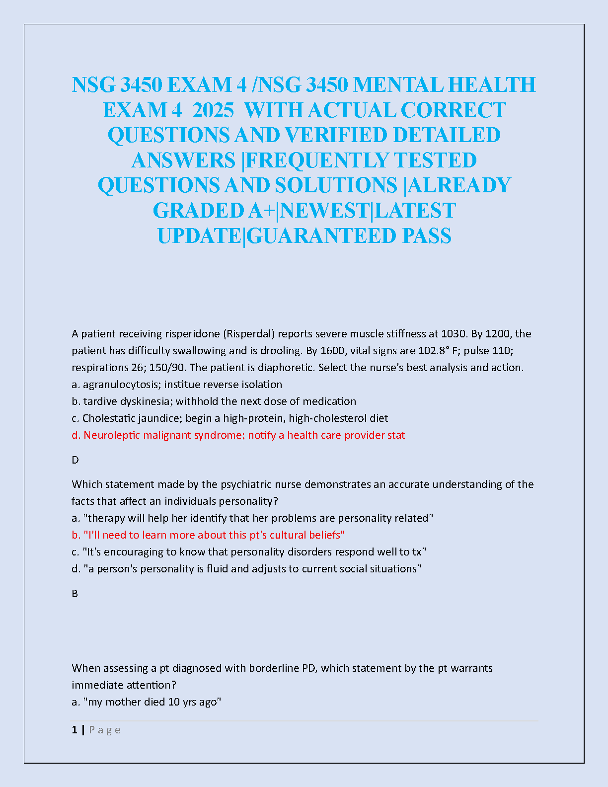 Ace your upcoming NSG 3450 Mental Health Exam 4 with this comprehensive test bank, fully updated for the 2025/2026 academic year. This resource is packed with a wide range of frequently tested questions, each accompanied by detailed, verified answers and rationales. Covering key topics like psychopharmacology, patient assessment, personality disorders, and cultural competency, this study guide is meticulously designed to mirror the actual exam format. Get immediate access to A+ graded material and gain the confidence you need to pass on your first attempt. Stop struggling and start studying smarter with this essential tool for success in your mental health nursing course.