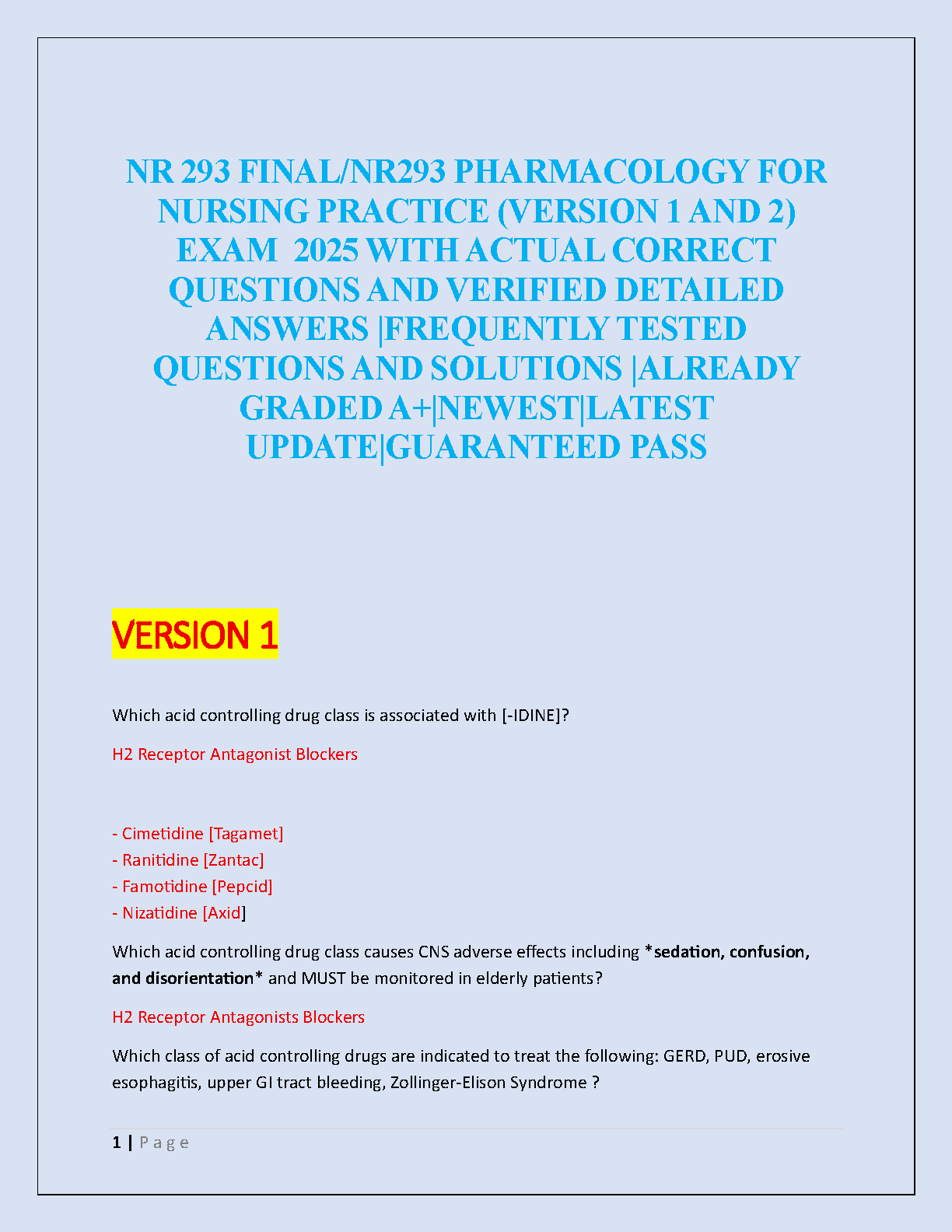Ace your NR 293 Pharmacology for Nursing Practice final exam with this comprehensive 2025 test bank, featuring both Version 1 and Version 2. This A+ graded study guide contains a complete set of actual exam questions with verified, detailed answers. Master frequently tested concepts and gain the confidence to pass on your first attempt. This is the latest, updated resource designed to guarantee your success in nursing pharmacology.