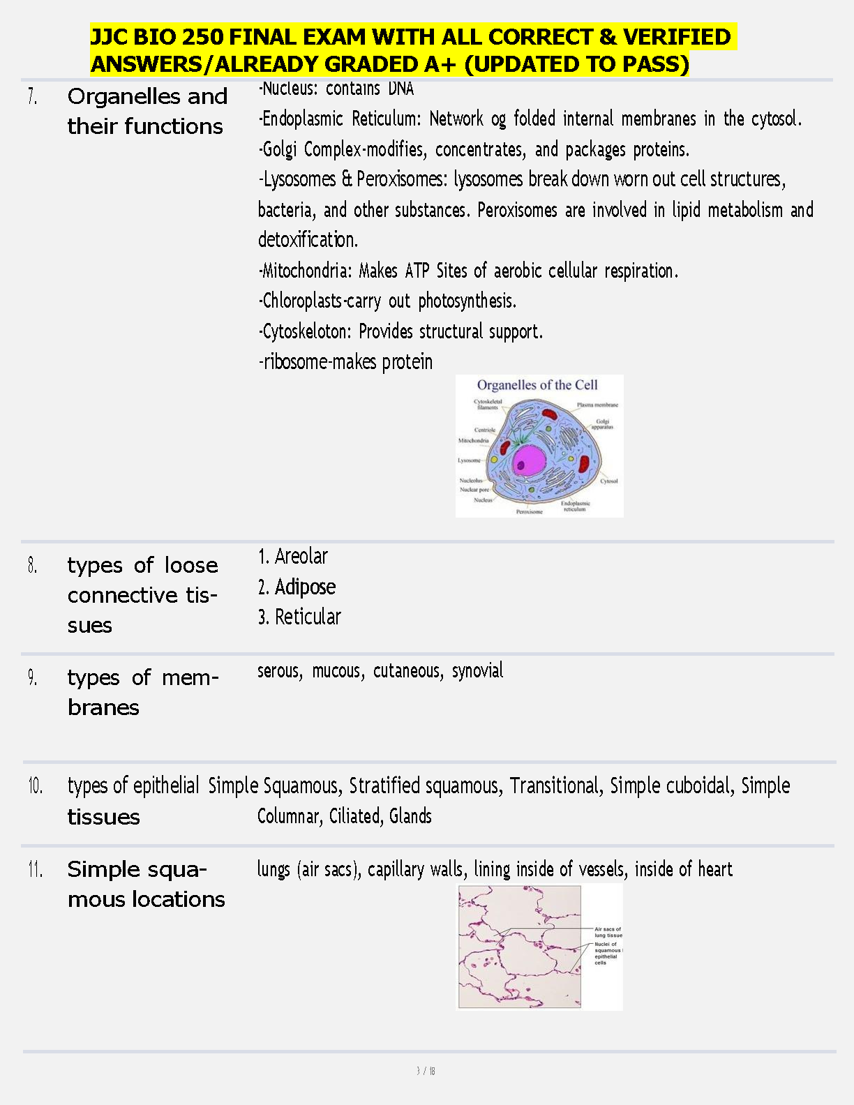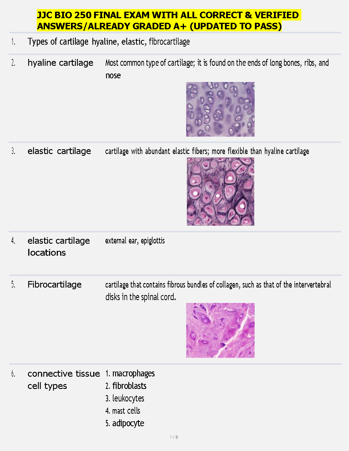 Unlock exam success with our latest 2025/2026 study guide for the JJC BIO 250 Final Exam. This comprehensive resource is packed with meticulously verified questions and A+ graded answers, designed to help you master key Anatomy and Physiology concepts and pass on your very first attempt. The guide provides in-depth coverage of essential topics, including detailed elaborations on types of cartilage (hyaline, elastic, fibrocartilage), connective tissues, and more. Stop worrying about resits and start studying smarter with this proven tool for acing your final exam.